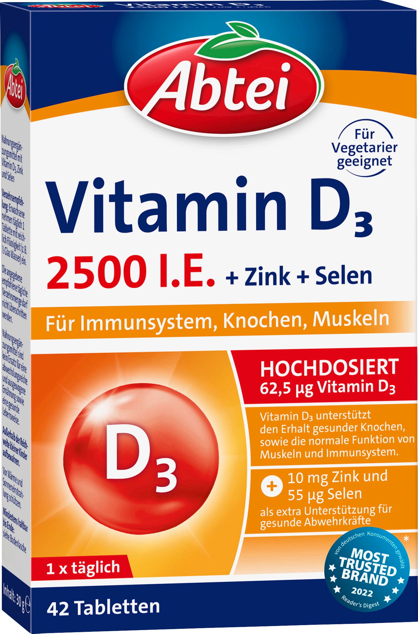 Abtei Vitamin D3 2500 I.E. innehåller högdoserat vitamin D3 kombinerat med zink och selen i en praktisk tablett. Vitamin D3 bidrar till att bibehålla normal muskelfunktion, benstomme och tänder samt stödjer celldelningen. Zink och selen bidrar till immunsystemets normala funktion.
