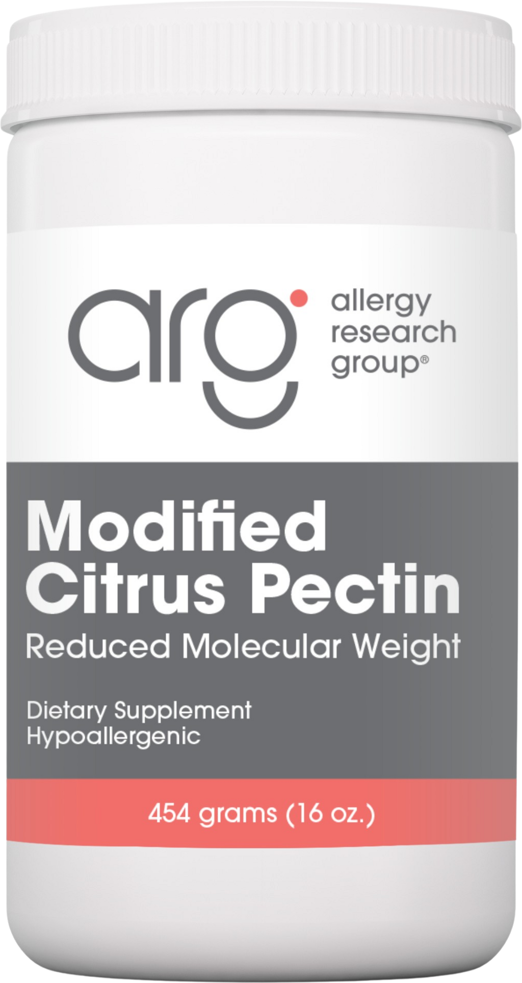 Modified Citrus Pectin från Allergy Research Group innehåller extraherat, modifierat pektin från citrusskal. En speciell process minskar storleken på pektinmolekylen för att möjliggöra bättre absorption.