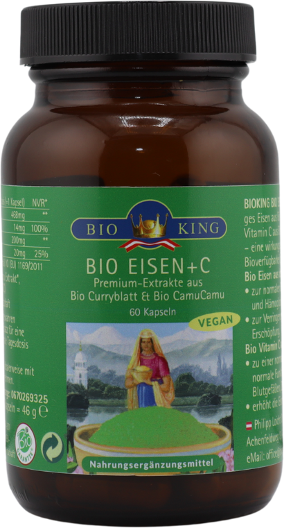 Kapslarna från BioKing innehåller järn från ekologiskt curryblad och C-vitamin från ekologiskt camu camu-fruktpulver. Kombinationen av växtbaserade ingredienser framställs med hjälp av skonsamma bearbetningsmetoder. Produkten är 100% certifierad ekologisk och fri från syntetiska tillsatser.