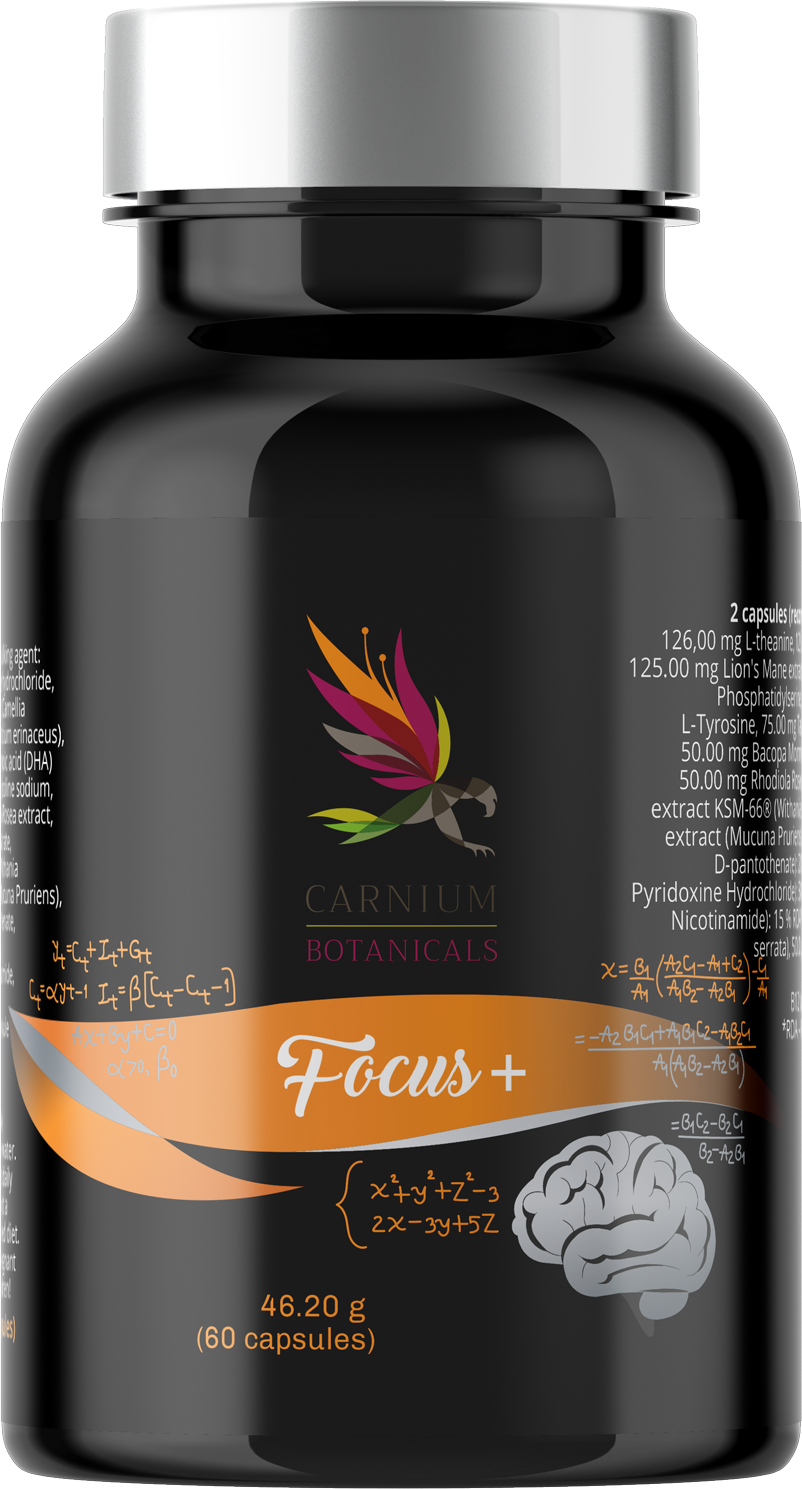 Focus+ från Carnium Botanicals innehåller en mängd vitaminer och mineraler. De veganska kapslarna innehåller bland annat L-teanin, L-karnitin, rosenrotextrakt, ashwagandhaextrakt, B-vitaminer och vitamin D3.