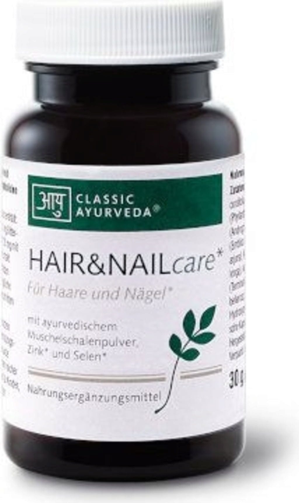HAIR&NAILcare-kapslarna från Classic Ayurveda kombinerar mineraliska ämnen med ett urval traditionella växtextrakt. Recepturen innehåller ashwagandha, amla och guduchi samt bhumyamalaki, tulsi och brahmi. Blandningen kompletteras med musselskalspulver, fänkål och lakritsrotsjuice för att stödja den dagliga näringen.