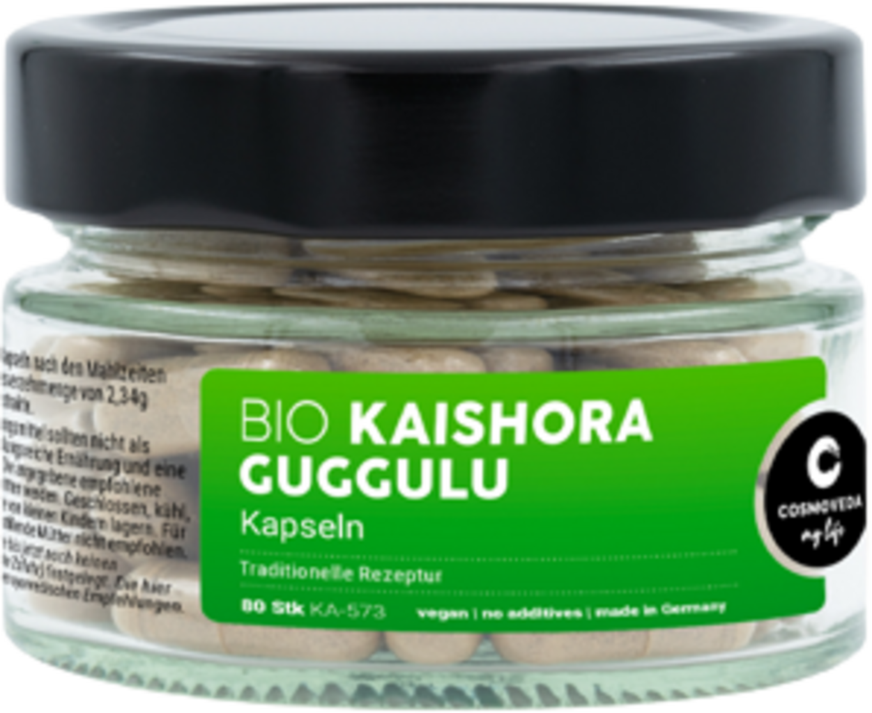 Kaishora Guggulu kapslar är ett ayurvediskt kosttillskott i vegetabiliska kapselskal, veganskt och certifierat ekologiskt.