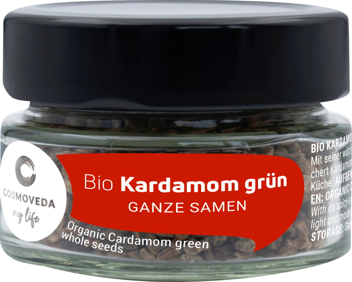 De svarta fröna från grön kardemumma används gärna nymalda i söta rätter, fina drycker, mjölk och kaffe för att göra det mer lättsmält och lättare för magen. Kardemumma är en av de äldsta och mest värdefulla kryddorna i världen, strax efter saffran och vanilj. Den var redan känd av de gamla grekerna och romarna. Kryddan kommer ursprungligen från Sydindien, idag även från Sri Lanka, Guatemala, Tanzania och Brasilien.