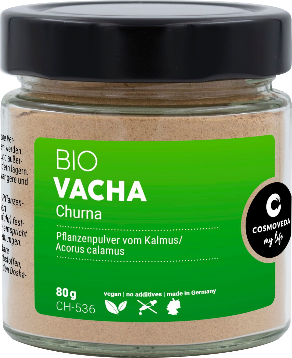 Vacha - Acorus calamus - är en 60-100 cm hög växt med ett rhizom som är ungefär lika tjockt som en tumme och som bildar en triangulär stam, fastsittande svärdformade blad och små gröna blommor. Roten används i ayurvedisk näring.