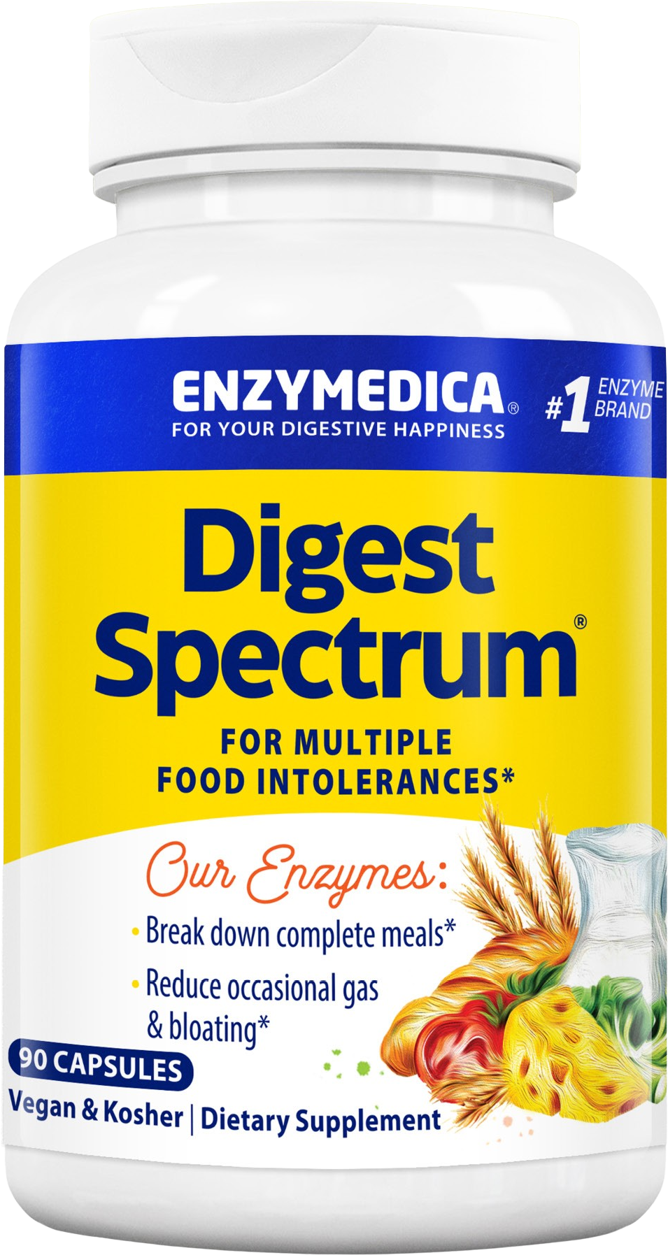 Digest Spectrum® innehåller en kombination av högpotenta enzymer som är utformade för att bryta ner olika livsmedelskomponenter som gluten, mjölksocker (laktos), mjölkprotein (kasein) och fenoler. Den inkluderade Thera-blend®-tekniken säkerställer att enzymerna kan förbli aktiva över hela pH-spektrumet i matsmältningskanalen. Formeln innehåller också enzymer som amylas, lipas, cellulas och proteas. Kapslarna är framställda utan genteknik, är kosher och lämpliga för vegansk kost.