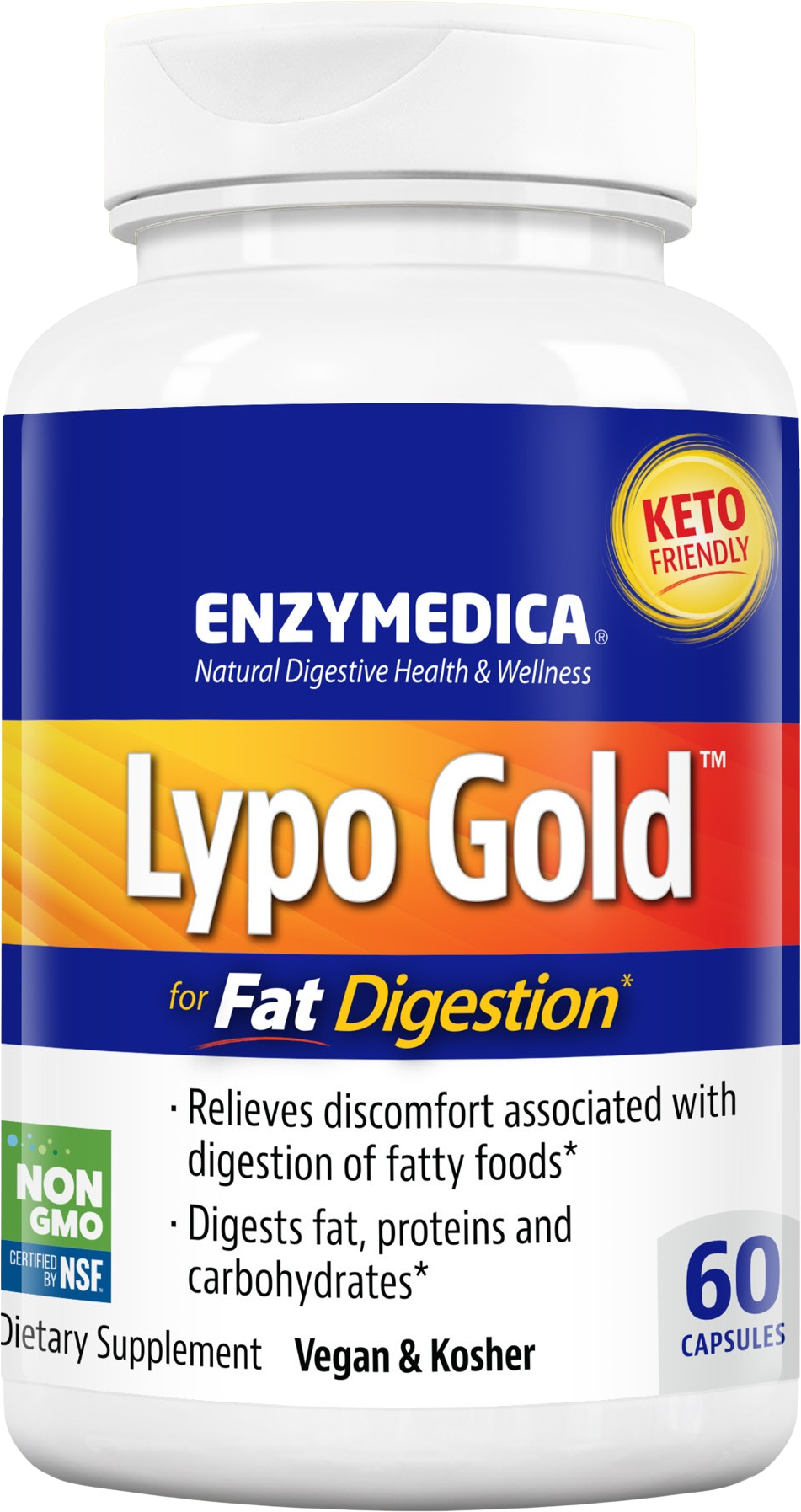 Lypo Gold® kännetecknas av en hög koncentration av enzymet lipas, som är speciellt utvecklat för att bryta ner fetter och oljor. Varje kapsel är utformad för att tas i samband med fetthaltiga måltider och för att stödja upptaget av de fettlösliga vitaminerna A, E, D och K. Tack vare den patenterade Thera-blend®-tekniken förblir de ingående enzymerna aktiva över hela pH-spektrumet i matsmältningskanalen. kapslarna är helt växtbaserade, kosher och fria från genteknik och soja.