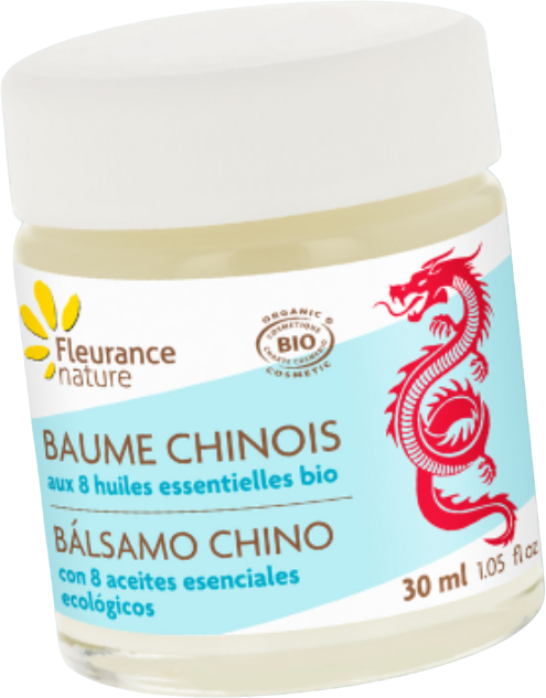 China balm erbjuder avslappnande egenskaper genom åtta eteriska oljor: pepparmynta, eukalyptus, niaouli, kryddnejlika, ingefära, timjan, kanel och ylang ylang. Basen är av kokos- och aprikoskärnolja, sheasmör och bivax. Den särskilt behaglig att applicera och lätt att massera in.