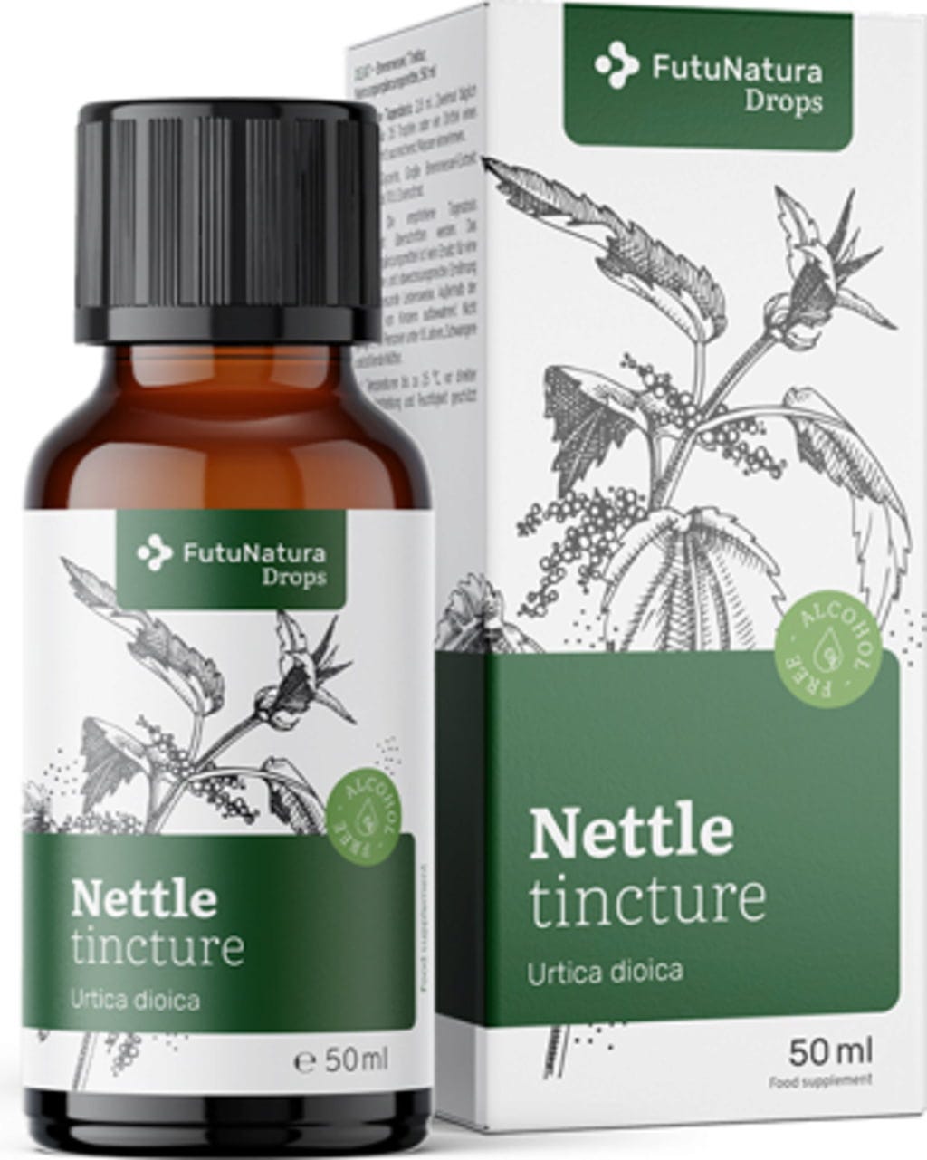 Brännässle-tinktur tillhör FutuNatura Drops-serien och levereras i en flaska med droppinsats för enkel dosering.