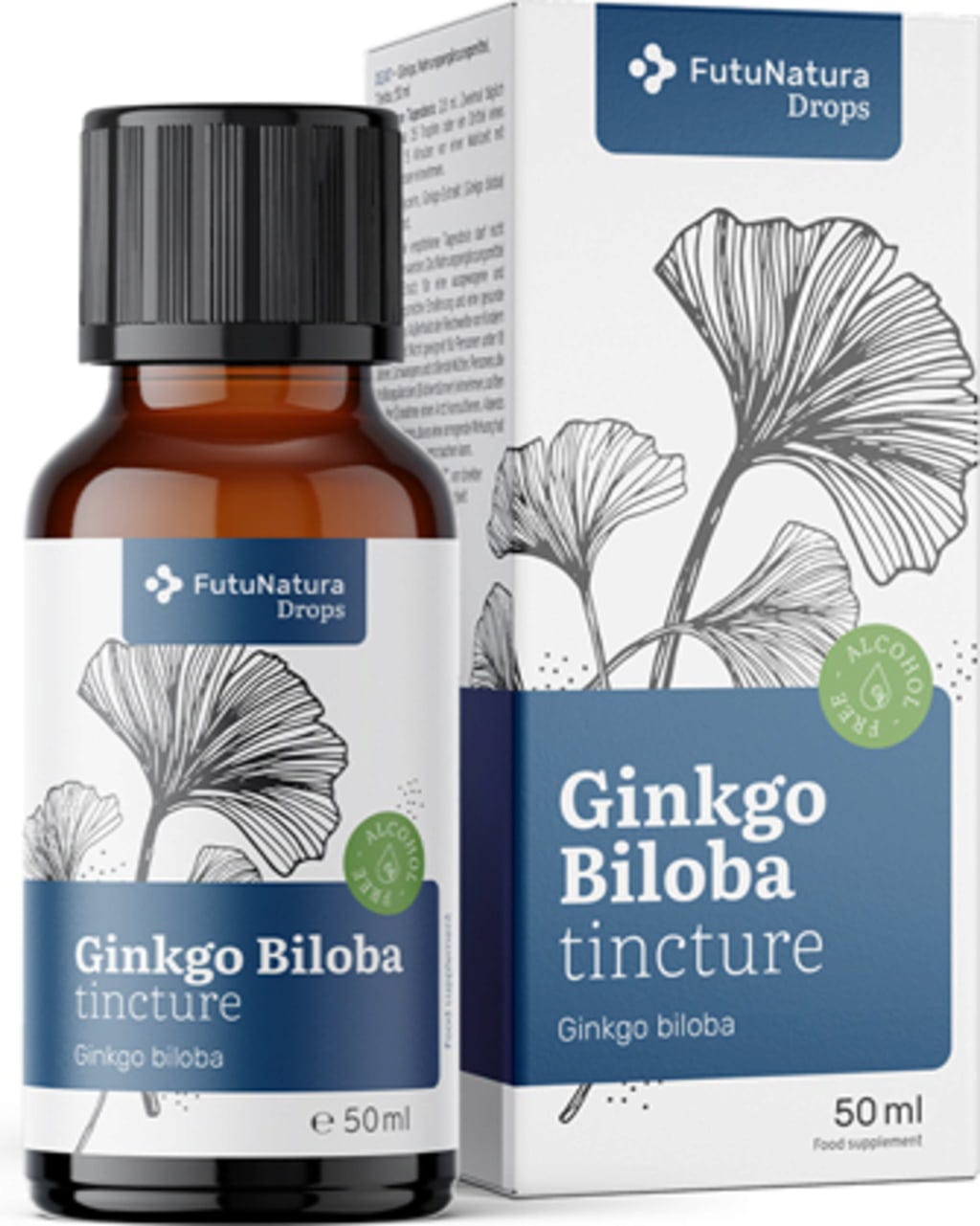 Ginkgo-tinktur tillhör produktlinjen FutuNatura Drops och levereras i en flaska med droppinsats för enkel och exakt dosering.