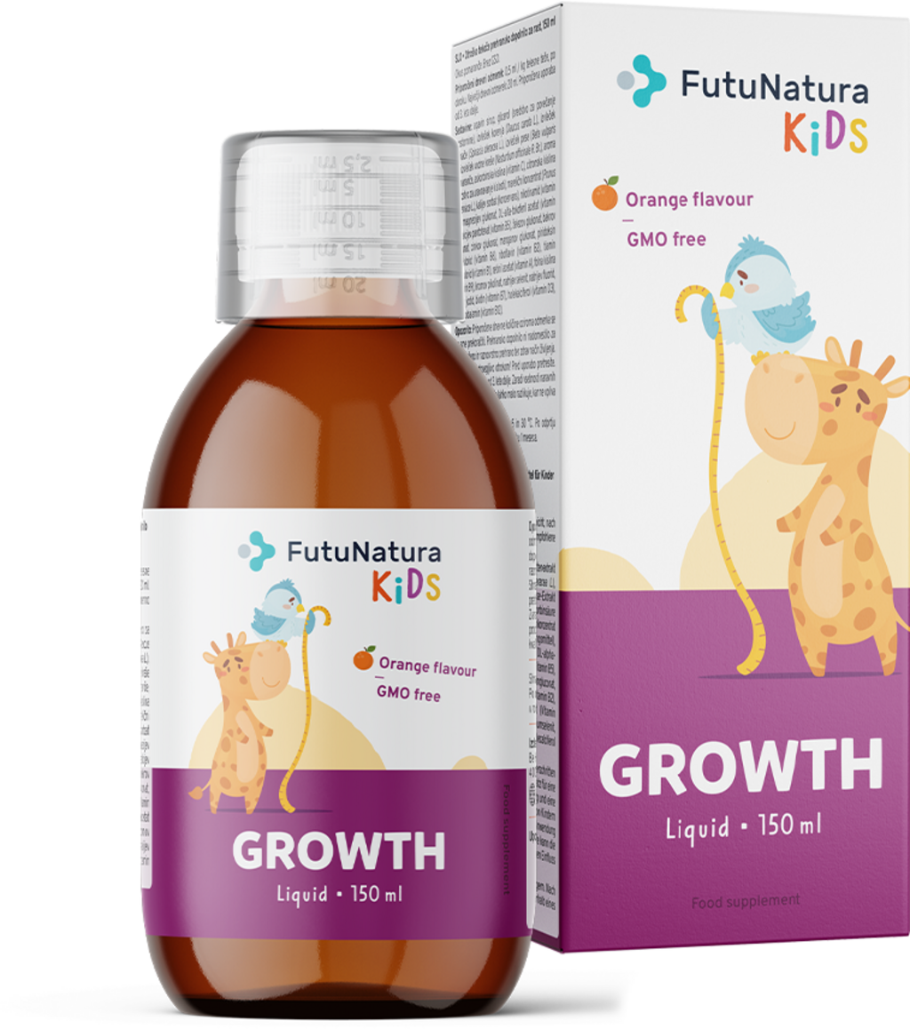 GROWTH - flytande kosttillskott för barn i tillväxtfasen från FutuNatura innehåller en unik kombination av växtextrakt, 11 vitaminer och 9 mineraler. Produkten är ett komplement till ditt barns och ungdoms dagliga näringsintag under utvecklingsperioden.