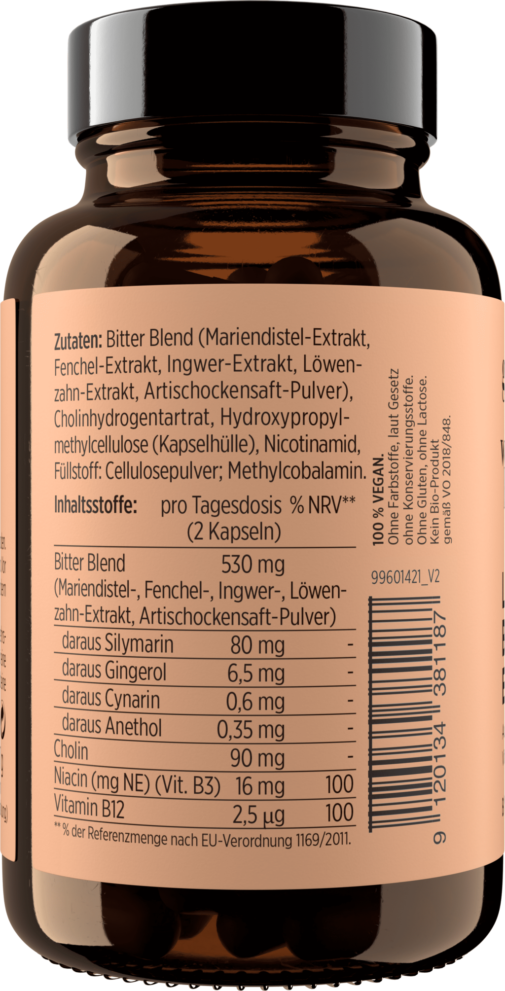 Bitterstoffmischung (Mariatistel (Silybum marianum), Fänkålsextrakt, Ingwer-Extrakt, Maskrosextrakt, kronärtskocka), Cholinhydrogentartrat, Hydroxypropylmethylcellulose (Kapselhülle), Nikotinamid, Fyllmedel (Cellulosa, Methylcobalamin)