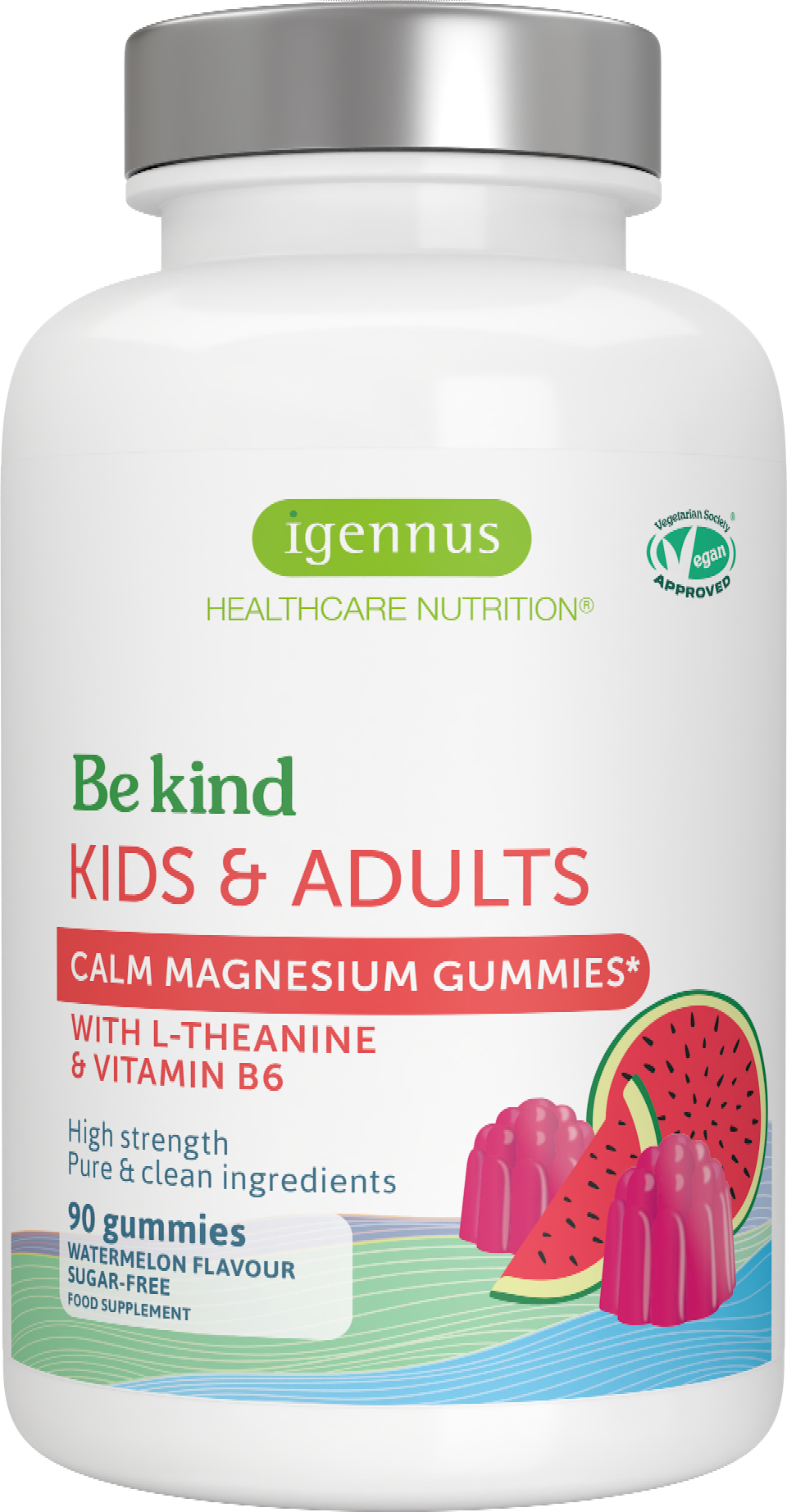 Dessa magnesiumgummier innehåller en blandning av magnesiumcitrat, L-theanin och vitamin B6. Barn från 4 års ålder kan ta gummierna dagligen. Formulan innehåller endast allergivänliga ingredienser, är vegansk och fri från artificiella färg- och smakämnen. Tack vare den söta smaken av vattenmelon smakar gummierna särskilt fruktigt.