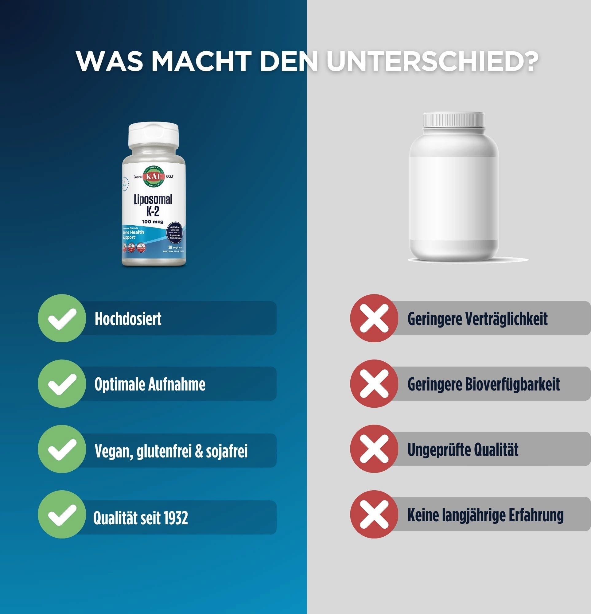 Fyllmedel (Cellulose), Kapselhülle (Cellulose), Frigöringsmedel (Magnesiumsalze von Speisefettsäuren, Siliciumdioxid), Lipidmischung (Solrosolja, Palmöl), Vitamin K2 (menakinon-7) MK-7