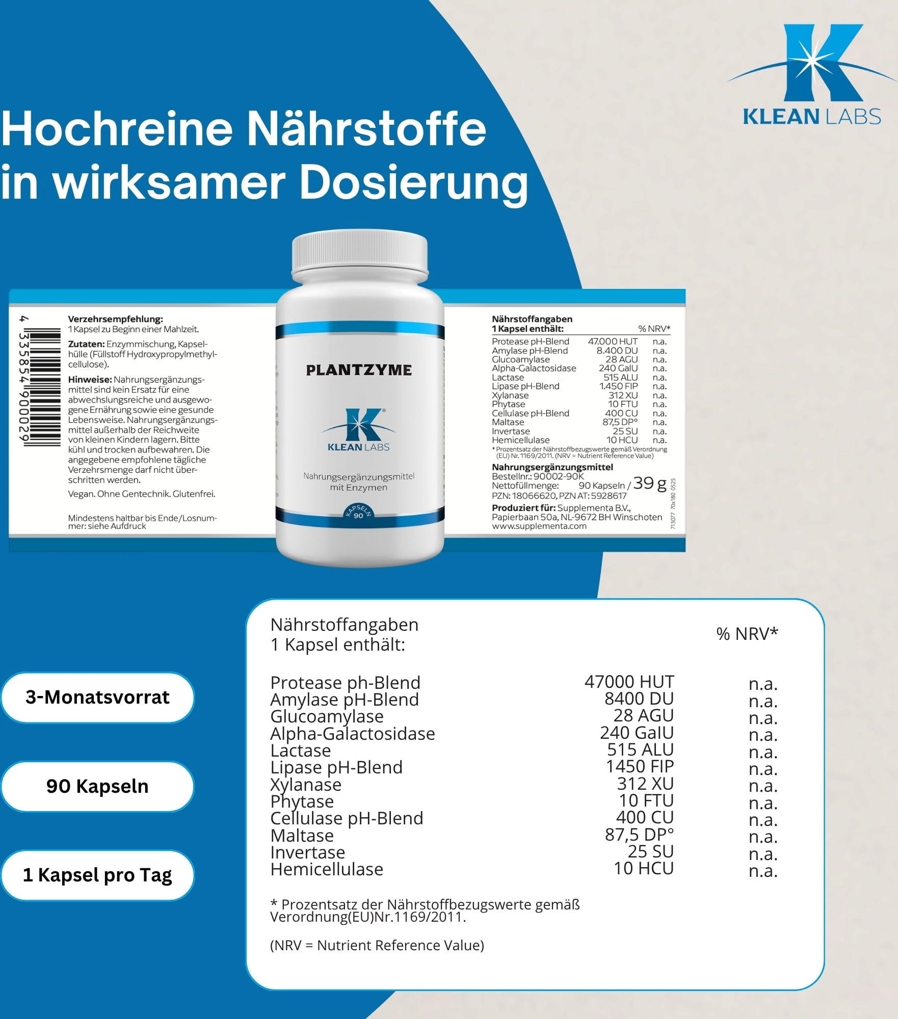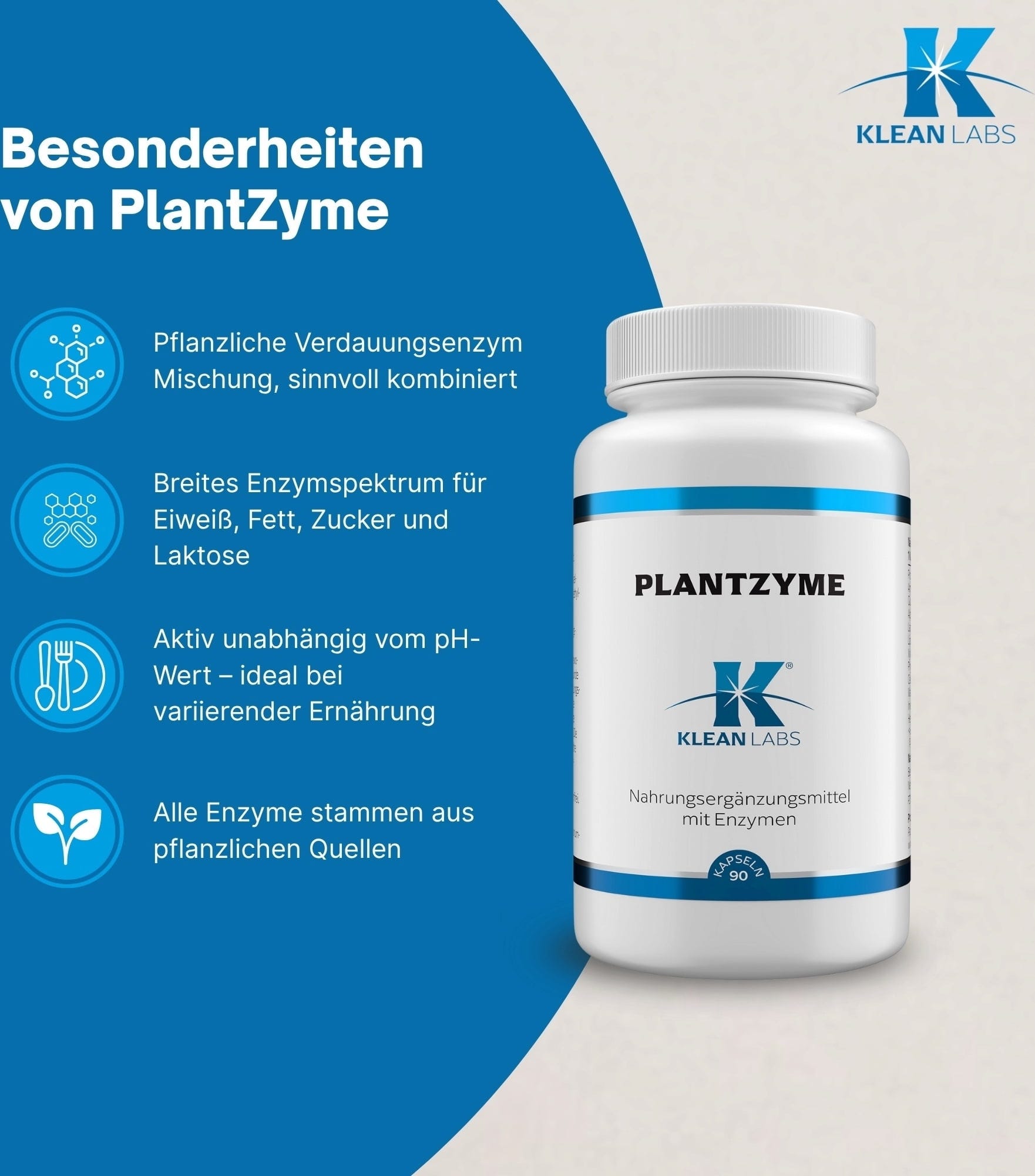 PlantZyme KLEAN LABS erbjuder en kombination av växtenzymer som amylas, proteas, lipas och laktas. Enzymerna är aktiva i olika pH-områden och stöder därmed nedbrytningen av olika livsmedelskomponenter. Produkten är vegansk, fri från animaliska ingredienser och konserveringsmedel.