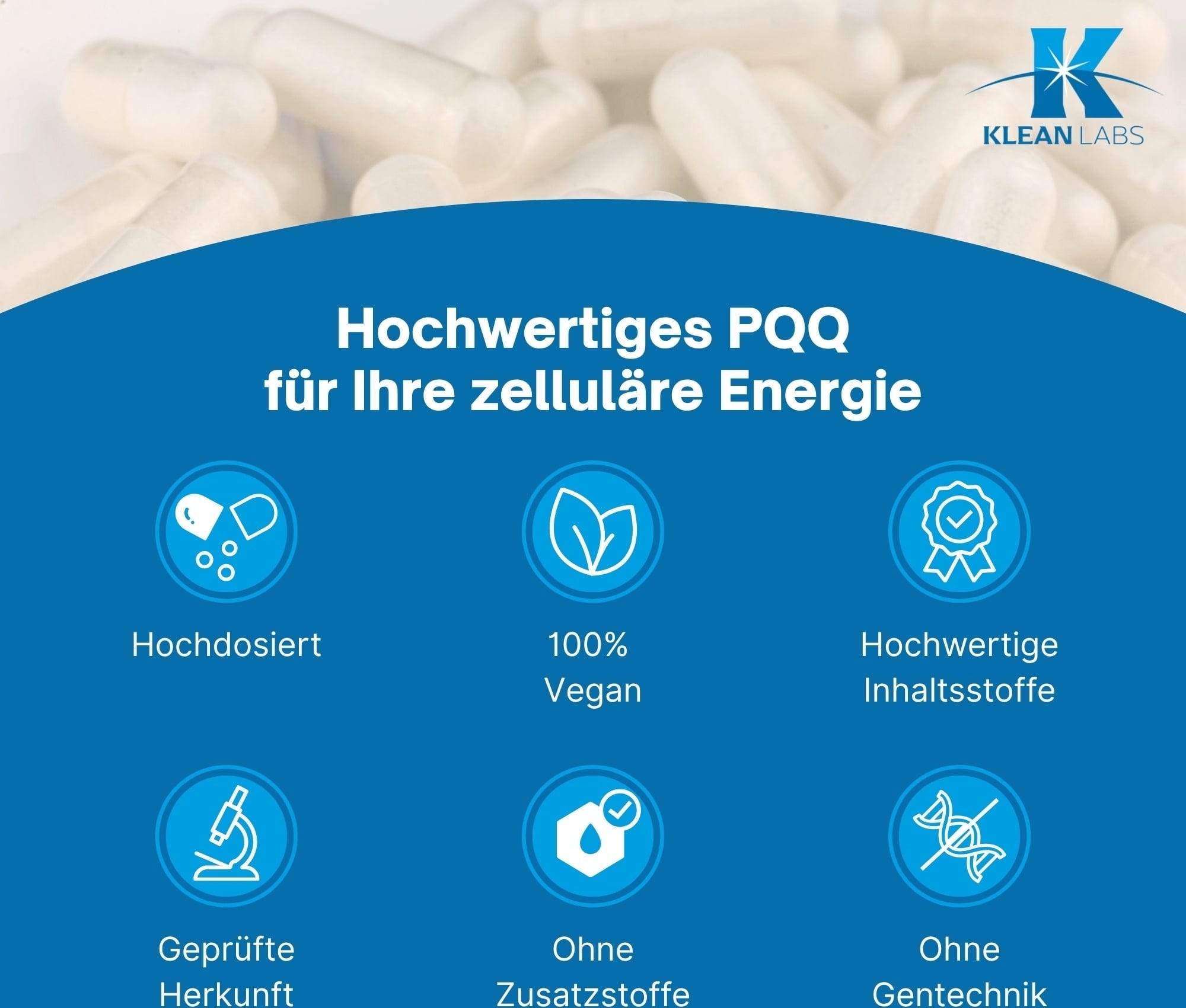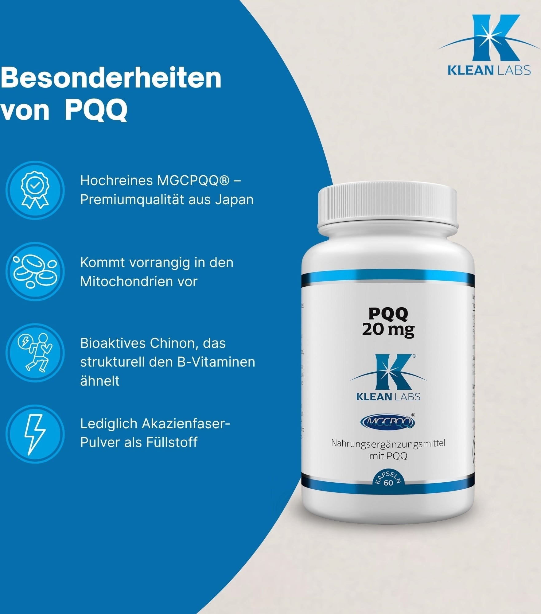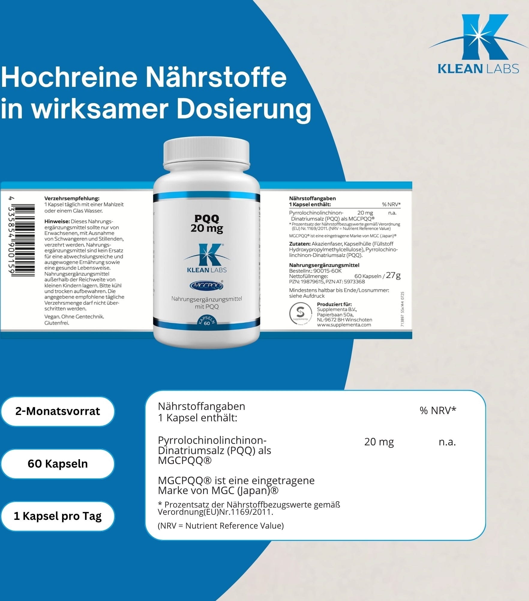PQQ (pyrrolochinolinkinon) är ett bioaktivt mikronäringsämne som förekommer naturligt endast i mycket små mängder. I denna produkt används MGCPQQ® från kontrollerad japansk tillverkning. Formulan är vegansk, fri från genetiskt modifierade ämnen och gluten.
