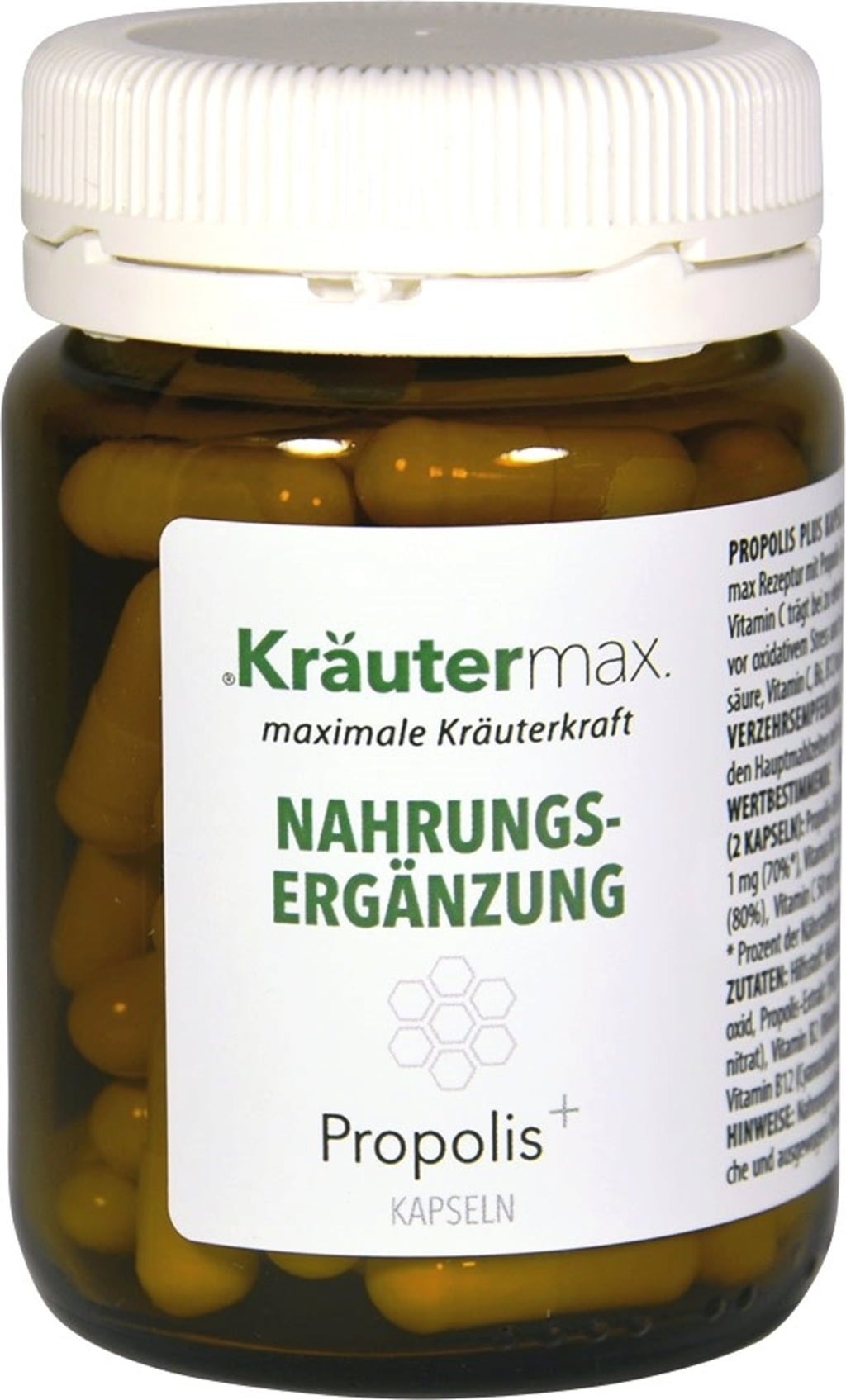 Propolis plus-kapslarna är tillverkade enligt Kräutermax originalrecept och innehåller propolisextrakt, vitamin B1, B2, B6 och B12 samt folsyra och C-vitamin.