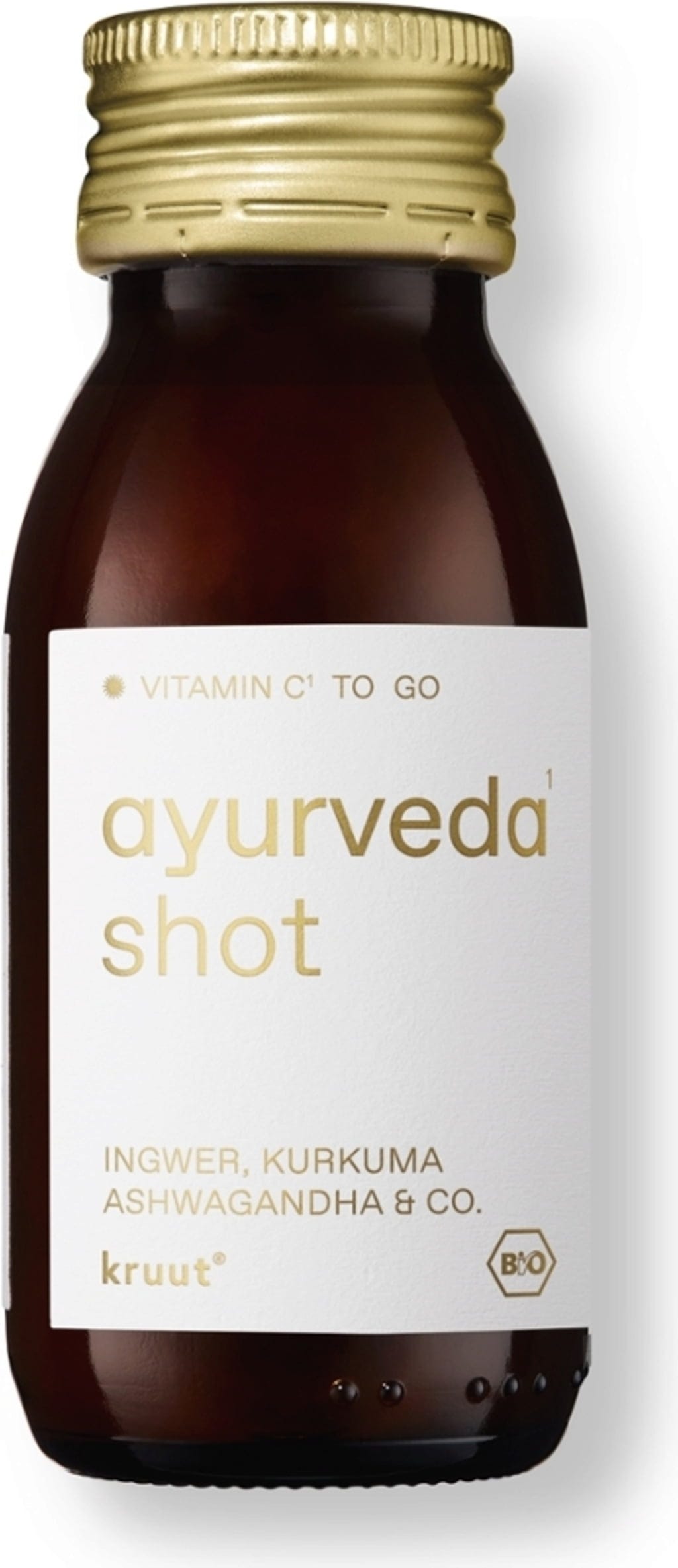 kruut Ayurveda Shot kombinerar en traditionell receptur med naturligt grumlig Demeter-äppelcidervinäger och rå blomsterhonung tillsammans med regional kvitten och typiska ayurvediska växter. Den flytande sammansättningen innehåller extrakt från ingefära, gurkmeja, ashwagandha, svartpeppar, saffran och kardemumma.
