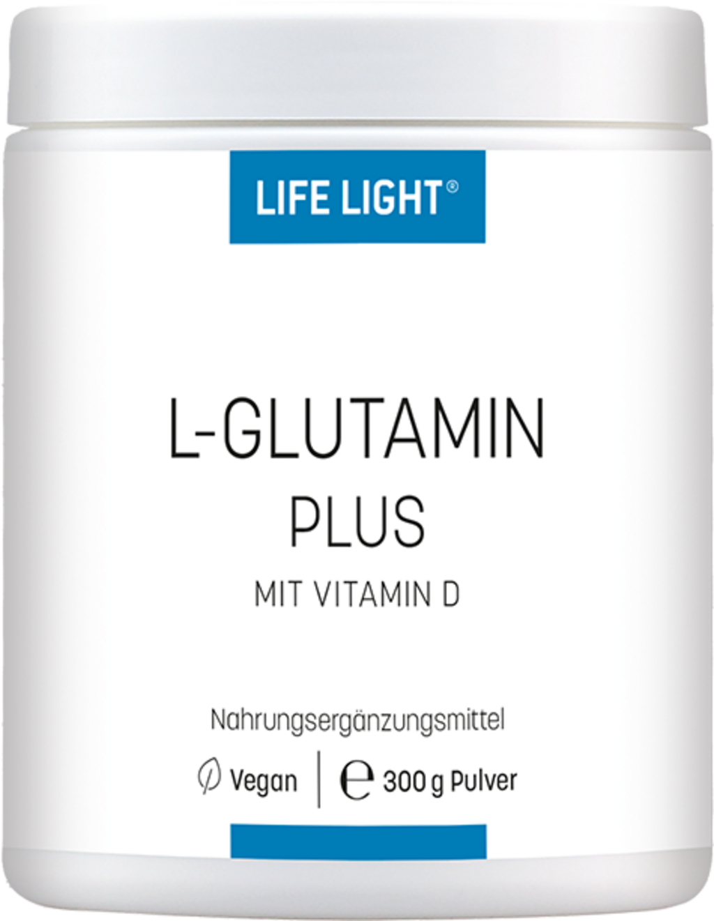 L-Glutamine plus från Life Light innehåller aminosyran L-Glutamin i kombination med D-vitamin.