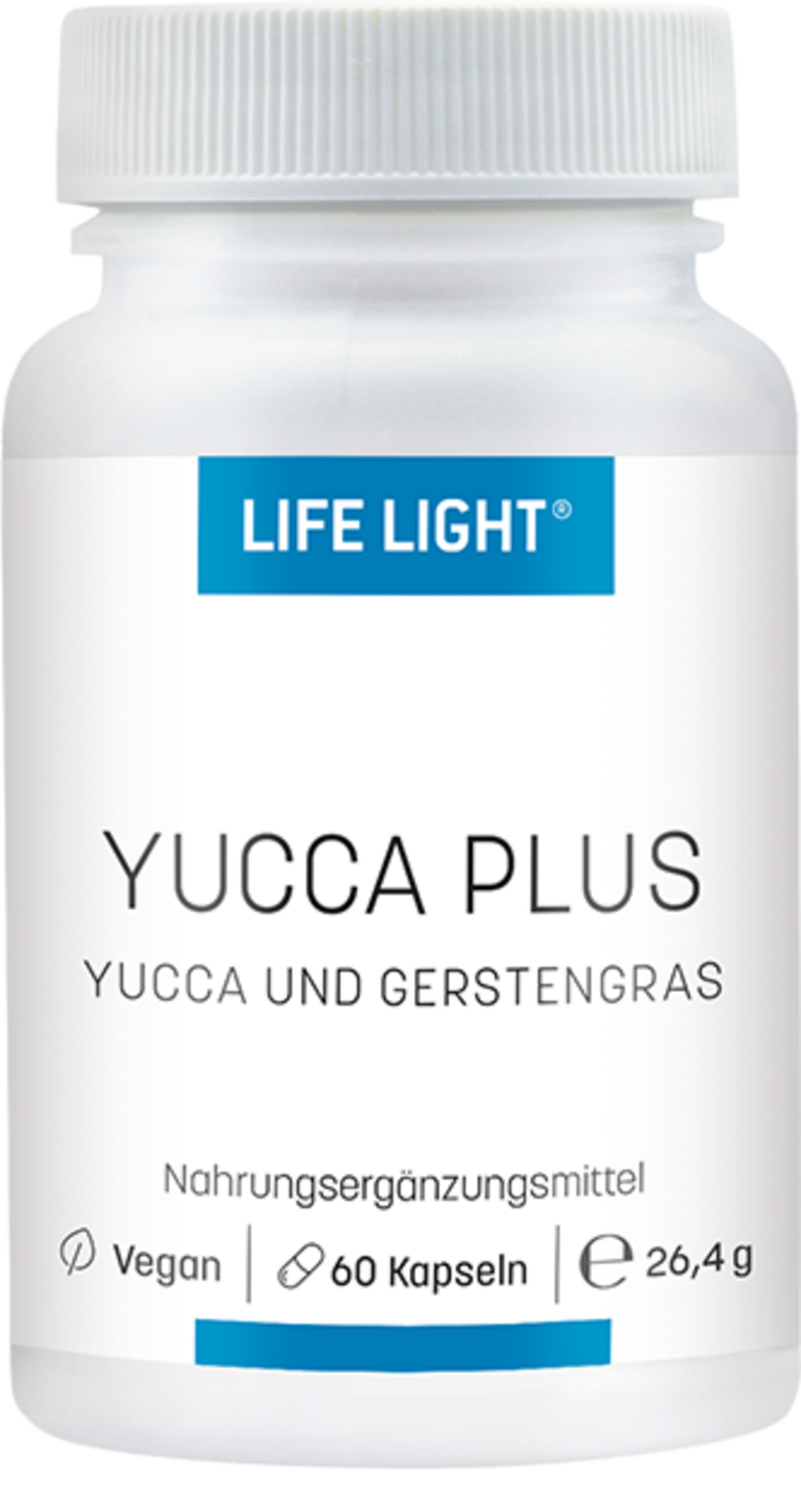 Yucca plus från LIFE LIGHT® kombinerar yucca-växten (Yucca schidigera) med korngräspulver i en högkvalitativ kapsel. Kombinationen innehåller naturliga saponiner, polyfenoler, vitaminer, mineraler och bioflavonoider. Formeln innehåller inga konstgjorda tillsatser och är lämplig för vegetarianer och veganer.