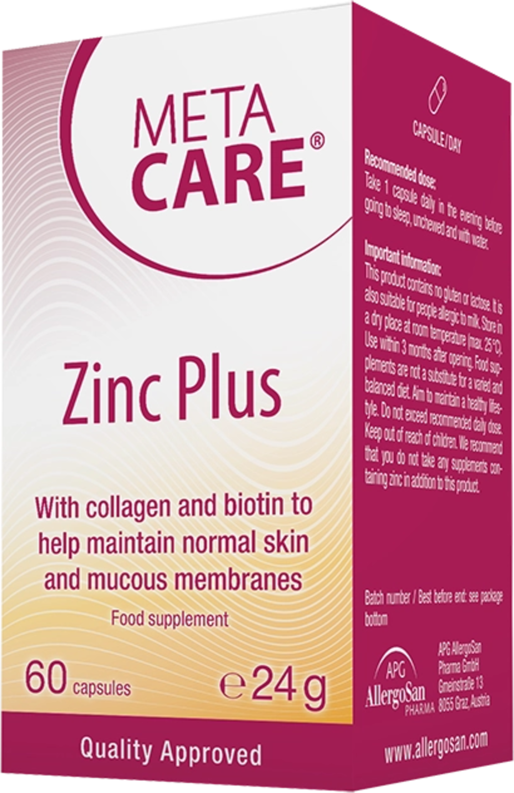 META-CARE® Zinc Plus-kapslarna innehåller 10 mg zink per kapsel. Dessutom innehåller de biotin, kollagen och L-histidin. Recepturen är helt fri från jäst, genteknik, gluten och laktos.