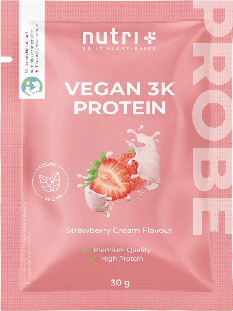 nutri + Vegan 3K Proteinpulver Probiergröße, Strawberry-Cream (30 g)