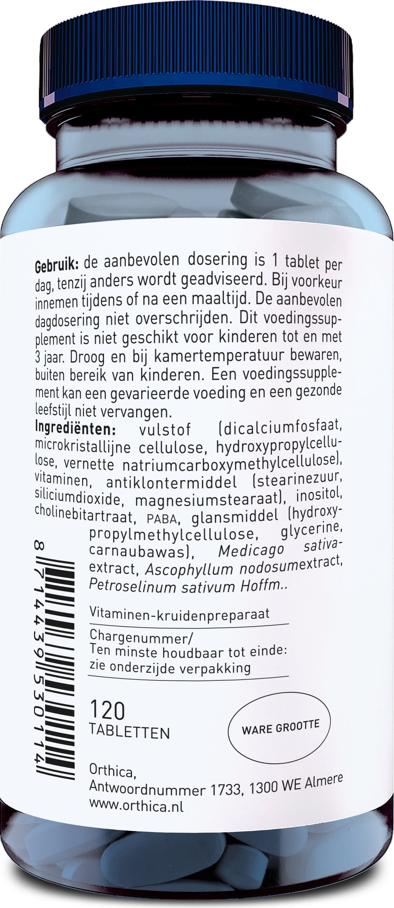 Fyllmedel (Calciumphosphate), L-Ascorbinsäure, Vitamin B5 (kalcium D-pantotenat), niacinamid, Riboflavin, Thiaminhydrochlorid, Para-aminobensoesyra (PABA), Inositol, Cholinbitartrat, Mikrokristallin cellulosa, Fyllmedel (Hydroxipropylcellulosa), Fyllmedel (Natriumkarboximetylcellulosa), Frigöringsmedel (Ätbara fettsyror, Magnesiumsalze von Speisefettsäuren, Siliciumdioxid), Överdrag (Hydroxypropylmethylcellulose), Fuktgivande medel (Glycerin), Pyridoxinhydrochlorid, Överdrag (Carnaubawachs), Persilja, kelp, Folsäure, Biotin, Cyanocobalamin