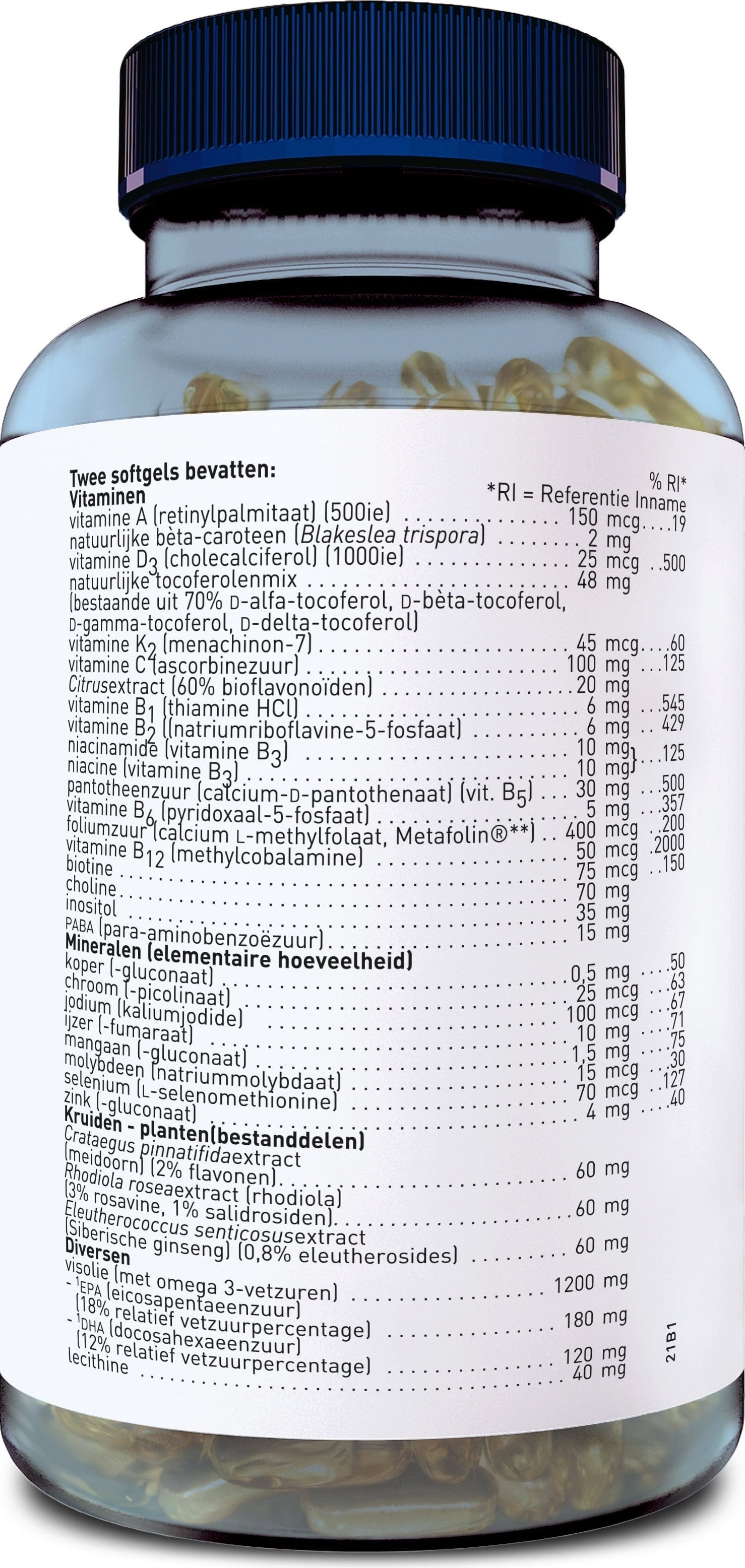 Fiskolja, Mineraler, Gelatine, Vitaminer, Sojalecitin, Sojaolja, Naturlig tokoferolblandning, Kolin (bitartrat), Inositol, Lutein-komplex, Hagtornsextrakt, Soja-isoflavoner, Blåstång (Fucus vesiculosus), Para-aminobensoesyra (PABA), Ginkgo biloba, Extrakt av citron, Lykopen, Sibirisk ginseng extrakt, Järnoxid gul (E172)[1], Glycerin[2]
