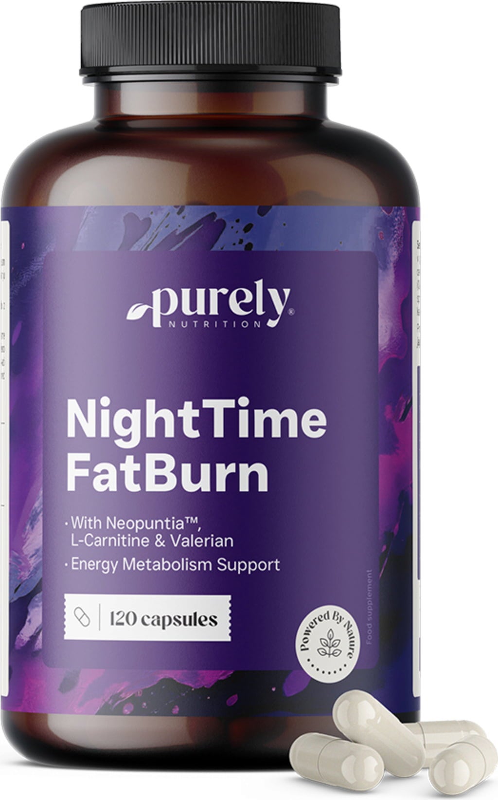 Kroppen återhämtar sig som mest under natten. NightTime FatBurn-kapslarna från Purely Nutrition innehåller därför en noggrant utvald kombination av växtextrakt och vitaminer för att stödja kroppen optimalt under vilan. Kapslarna är berikade med Neopuntia™ (ett patenterat, naturligt extrakt från opuntiakaktusens blad), vitamin B3 och B6, L-karnitin samt valerianaextrakt.