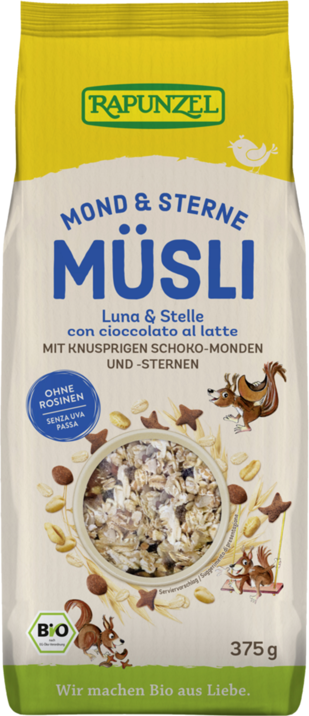 Luftiga månar och stjärnor av chokladknaprigt, näringsrika spannmålsflingor, fullkornsflakes och söta mjölkchokladrasp gör detta müsli till en frukostfavorit för både barn och vuxna! Perfekt att blanda med färsk frukt, yoghurt eller växtbaserade drycker. Spannmålet i detta müsli kommer från ekologiska odlingar i Tyskland.