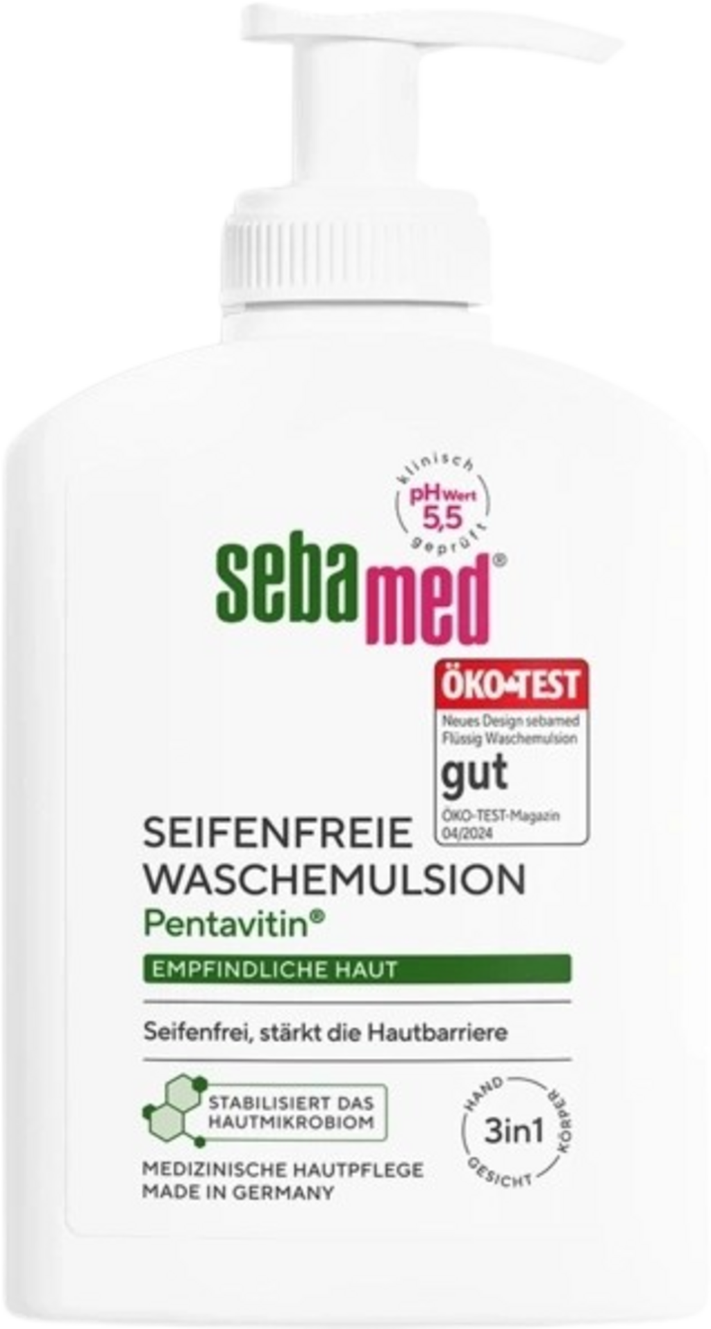 De milda rengöringsämnena i Pentavitin® tvättemulsion från sebamed rengör varsamt din känsliga hud. Den tvål- och mikroplastfria formulan har ett pH-värde på 5,5 och är lämplig för daglig hudrengöring. Tvättemulsionen är berikad med allantoin, glycerin och panthenol.