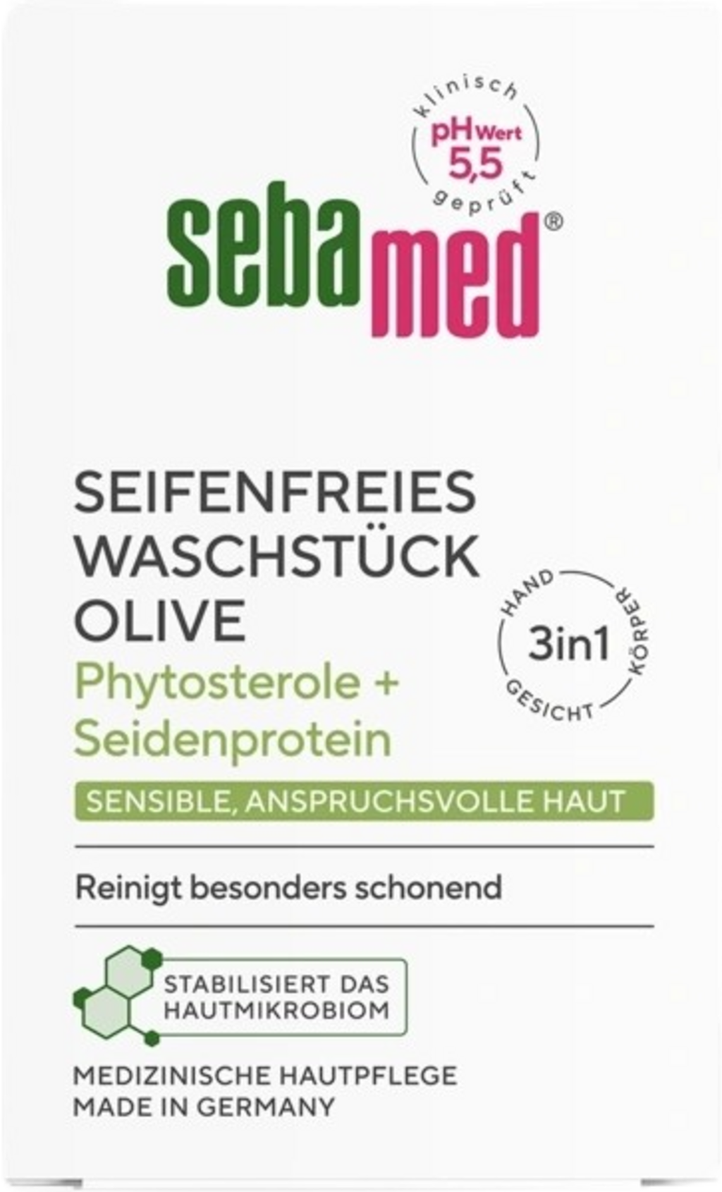 Tvålfri rengöringskaka från sebamed som varsamt rengör och ger nödvändig fukt åt känsliga och problematiska hudtyper. Ett trippelt vårdkomplex bestående av fytosteroler, silkesproteiner och olivolja förhindrar att huden torkar ut och ger en behaglig hudkänsla.