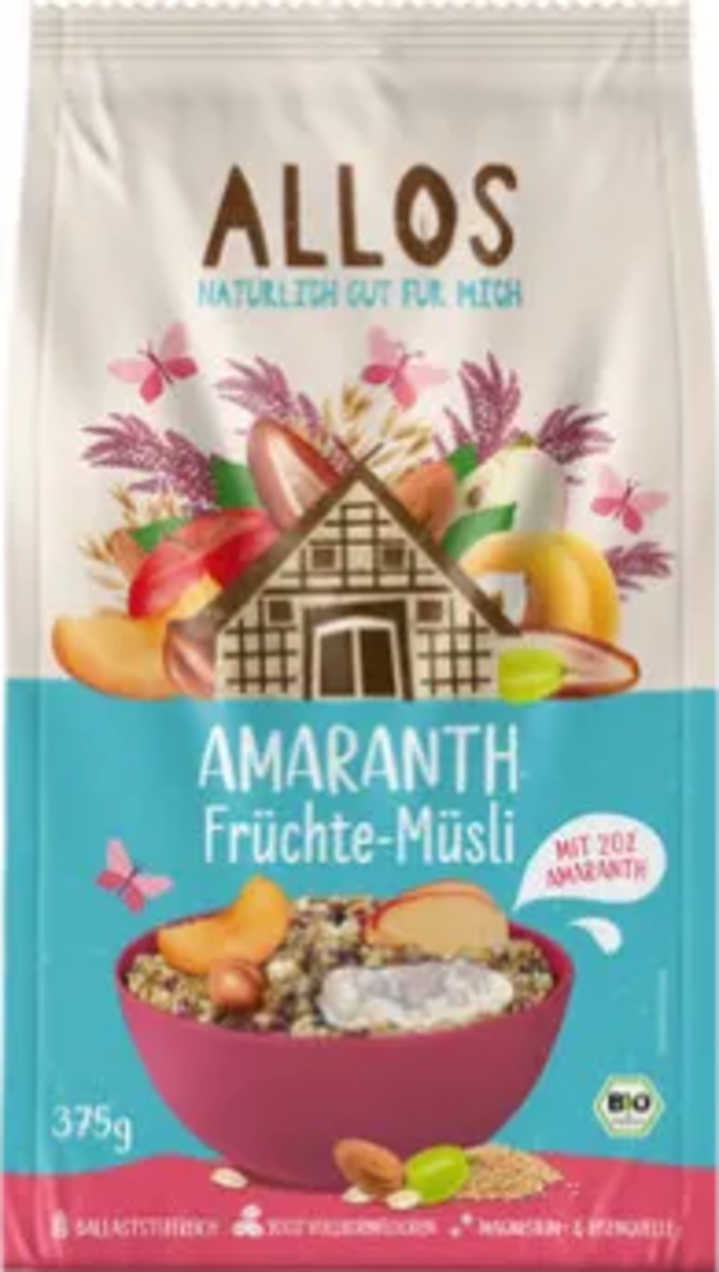 Den här müslivarianten kombinerar poppad amaranth med torkad frukt som sultanrussin, aprikoser, dadlar och äppelbitar. En riktig fruktgodis, även tidigt på morgonen. sötman från honung avrundar smaken. Med 100% fullkornsflingor.