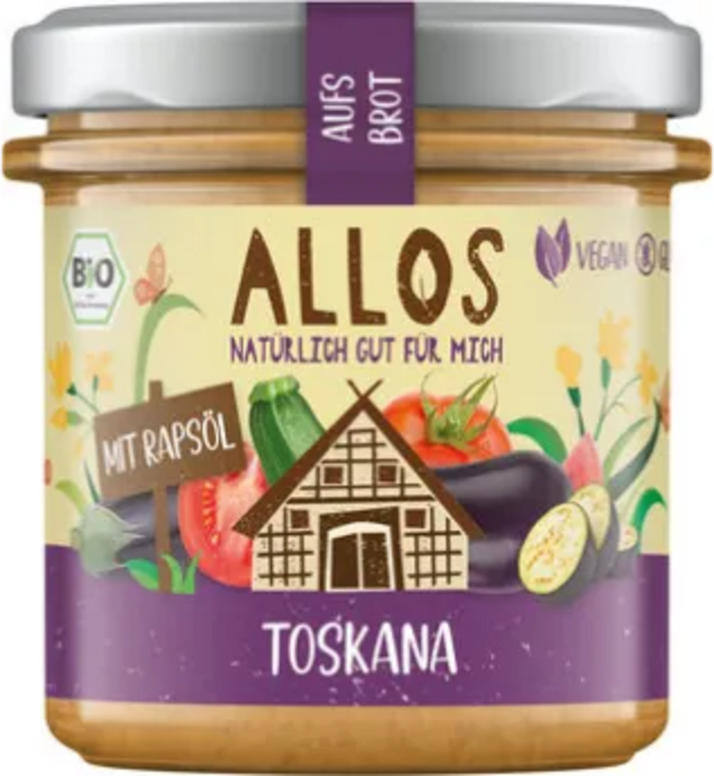 Den veganska Ekologisk Aufs Brot Toscana från ALLOS smakar rejält och krämigt på snackbröd. Pålägget är gjort på auberginer, zucchini, paprika och rapsolja. Kryddor avrundar receptet perfekt och säkerställer en harmonisk smak i gommen.