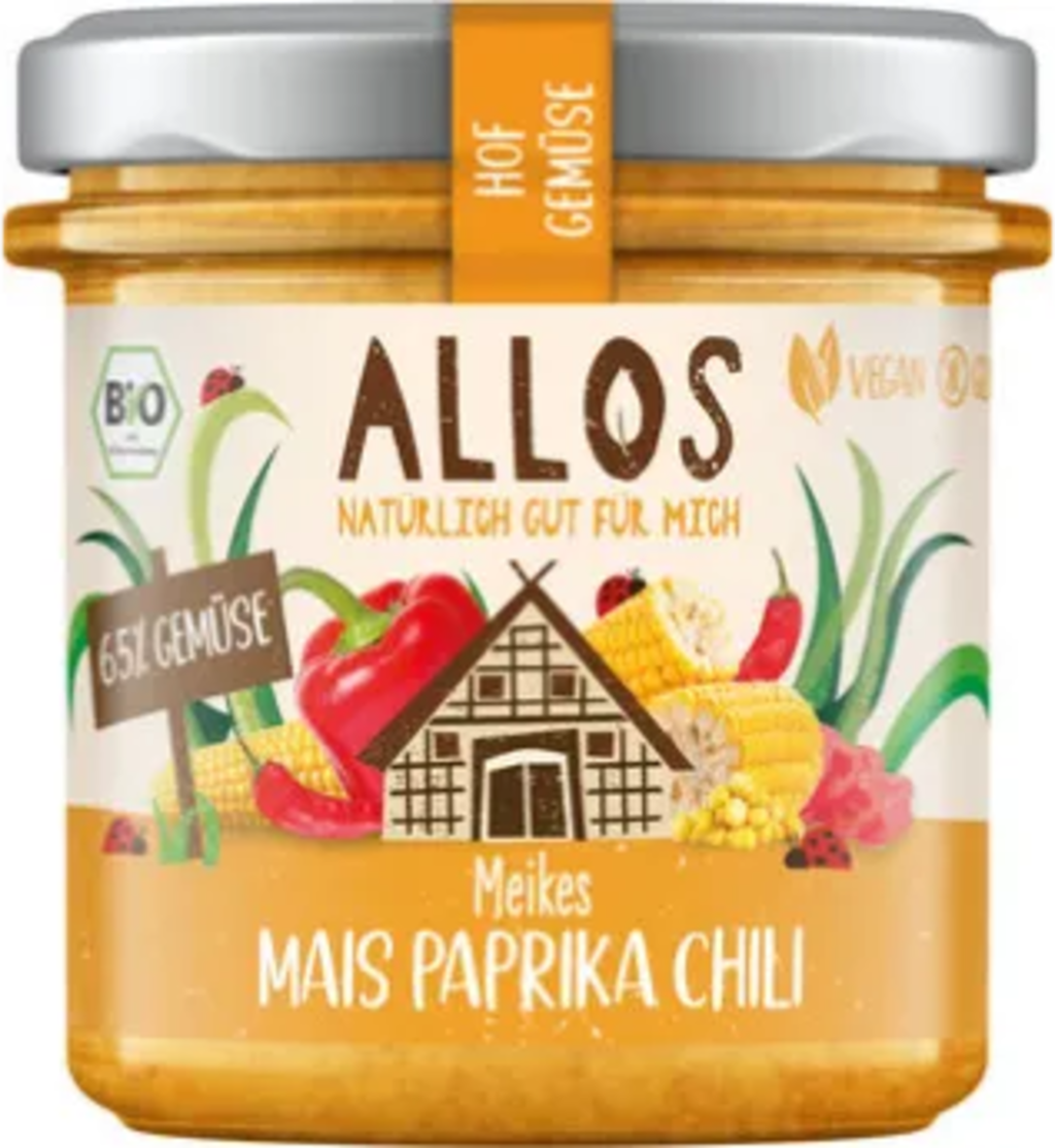 Grönsaker från Ekologisk Odling Meikes Majs Paprika Chilliär ett exceptionellt pålägg från ALLOS Den färgglada trion skämmer bort smaklökarna med den lätta sötman från paprika och majs och den behagliga kryddigheten från chili. Med 65% vegetabiliskt innehåll. Naturligt veganskt och glutenfritt.