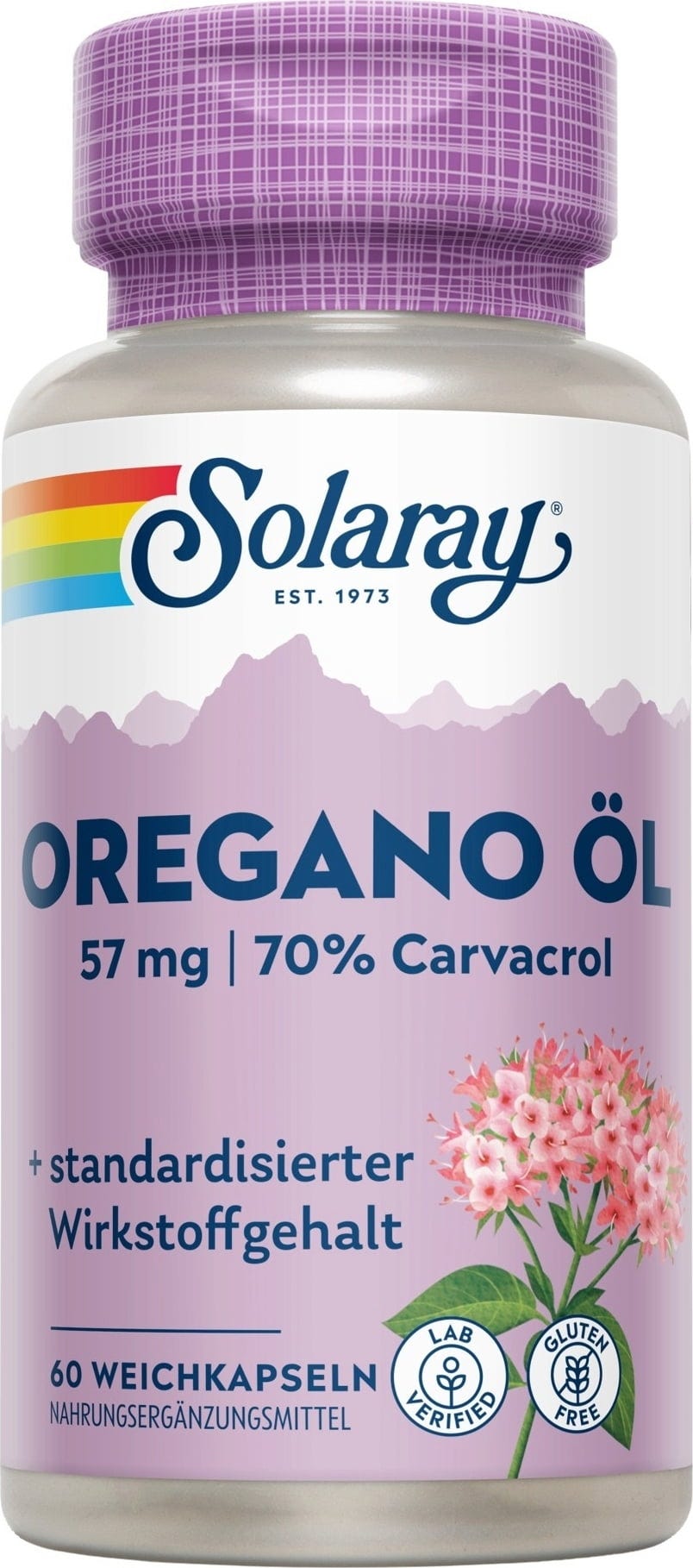 Oregano olja från Solaray innehåller 40 mg karvacrol per kapsel.