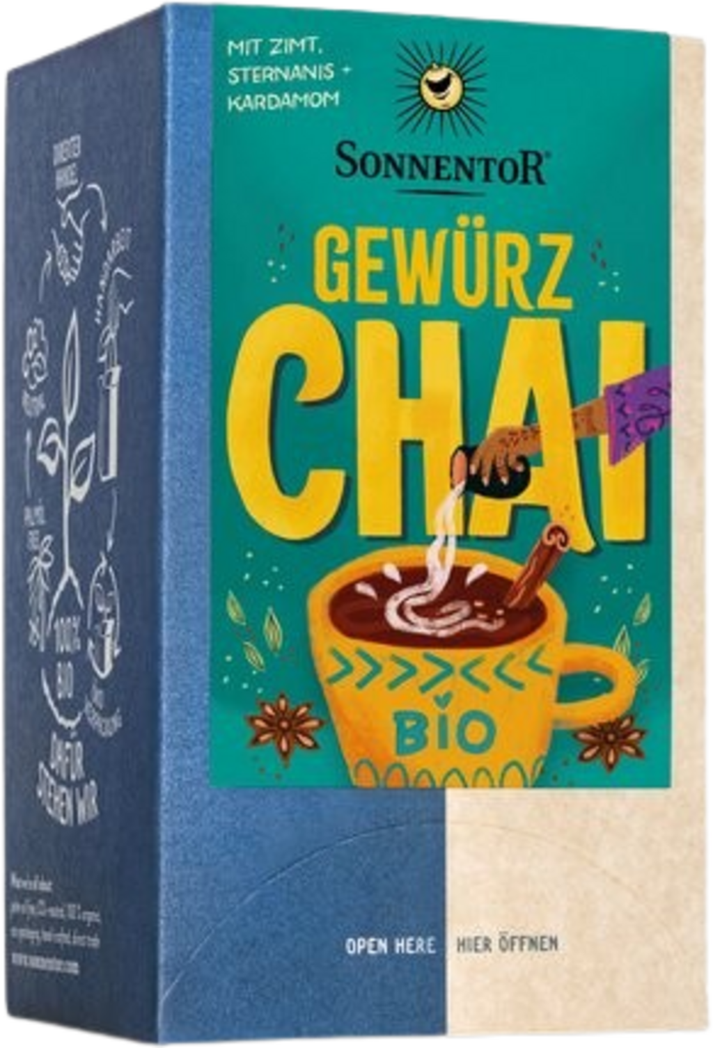 Ett chai-te med hela variationen av kryddor! Det är vad Sonnentors unika kryddade chai-te-blandning erbjuder. Baserat på ingefära, kanel och rooibos utvecklas de bästa smakerna på ett intensivt sätt. Se fram emot en tesmak som påminner om choklad och en söt och kryddig variant.