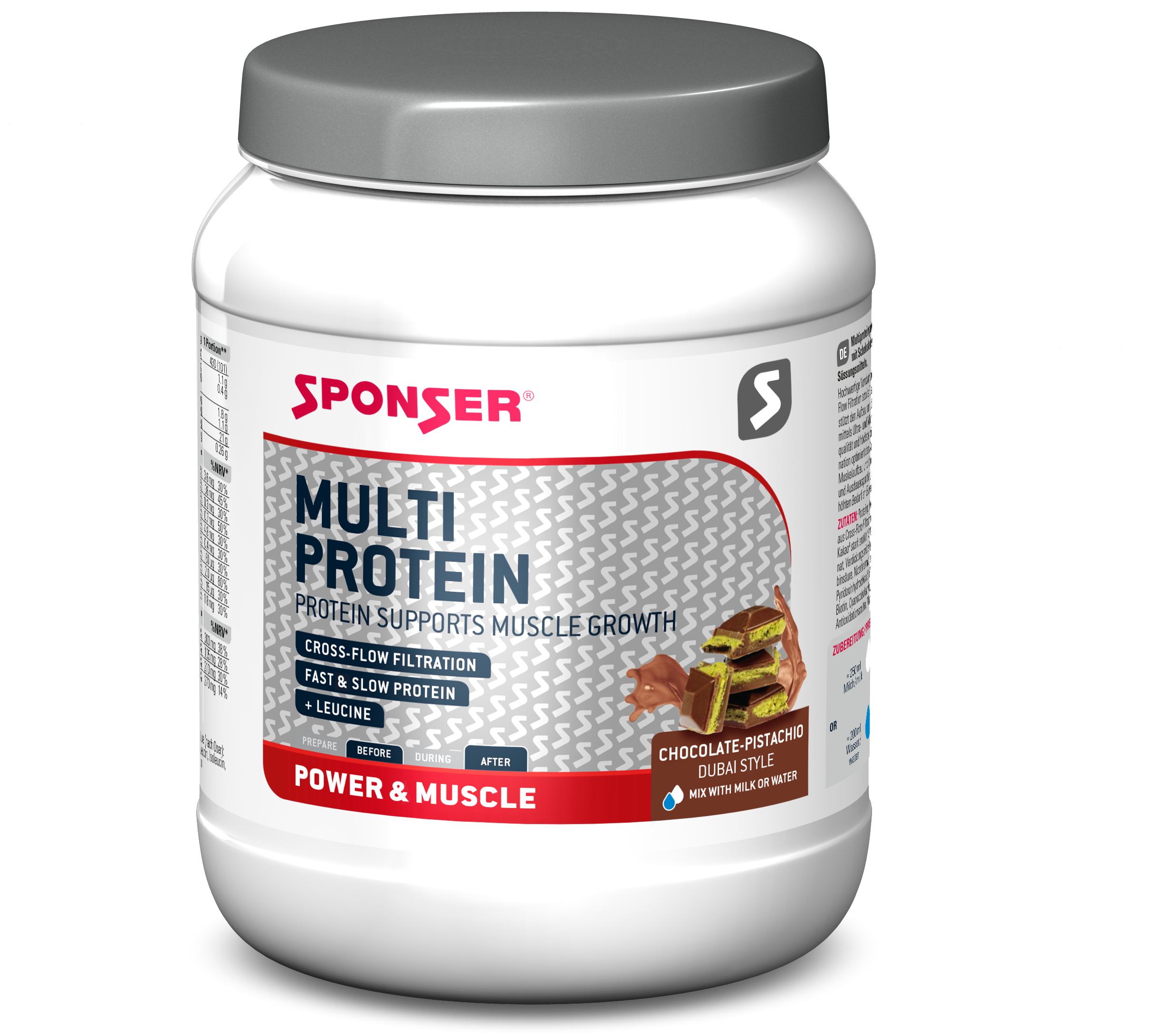 Det specialutvecklade Multi Protein är ett multikomponentprotein som består av högkvalitativt mjölkprotein och vassleprotein, kompletterat med äggalbumin. På grund av den skonsamma bearbetningsmetoden med mikrofiltrering och den höga andelen kasein kallas proteinpulvret även för nattprotein. Proteinpulvret innehåller också en hög andel BCAAs och aminosyran L-leucin.
