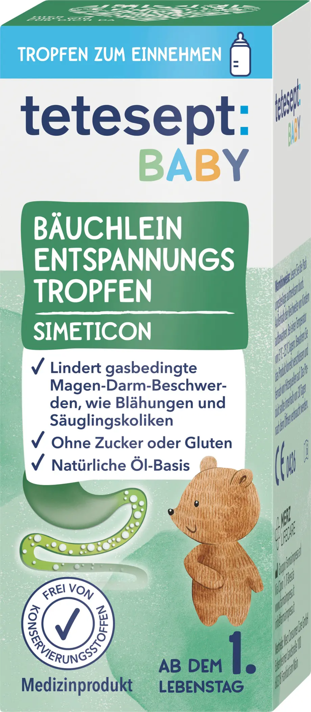 Babymagsdropparna från tetesept kan användas från den första levnadsdagen. Dropparna är baserade på simetikon (40 mg/0,6 ml) i en naturlig oljeemulsion. Formulan är vegansk och fri från tillsatt socker och gluten.