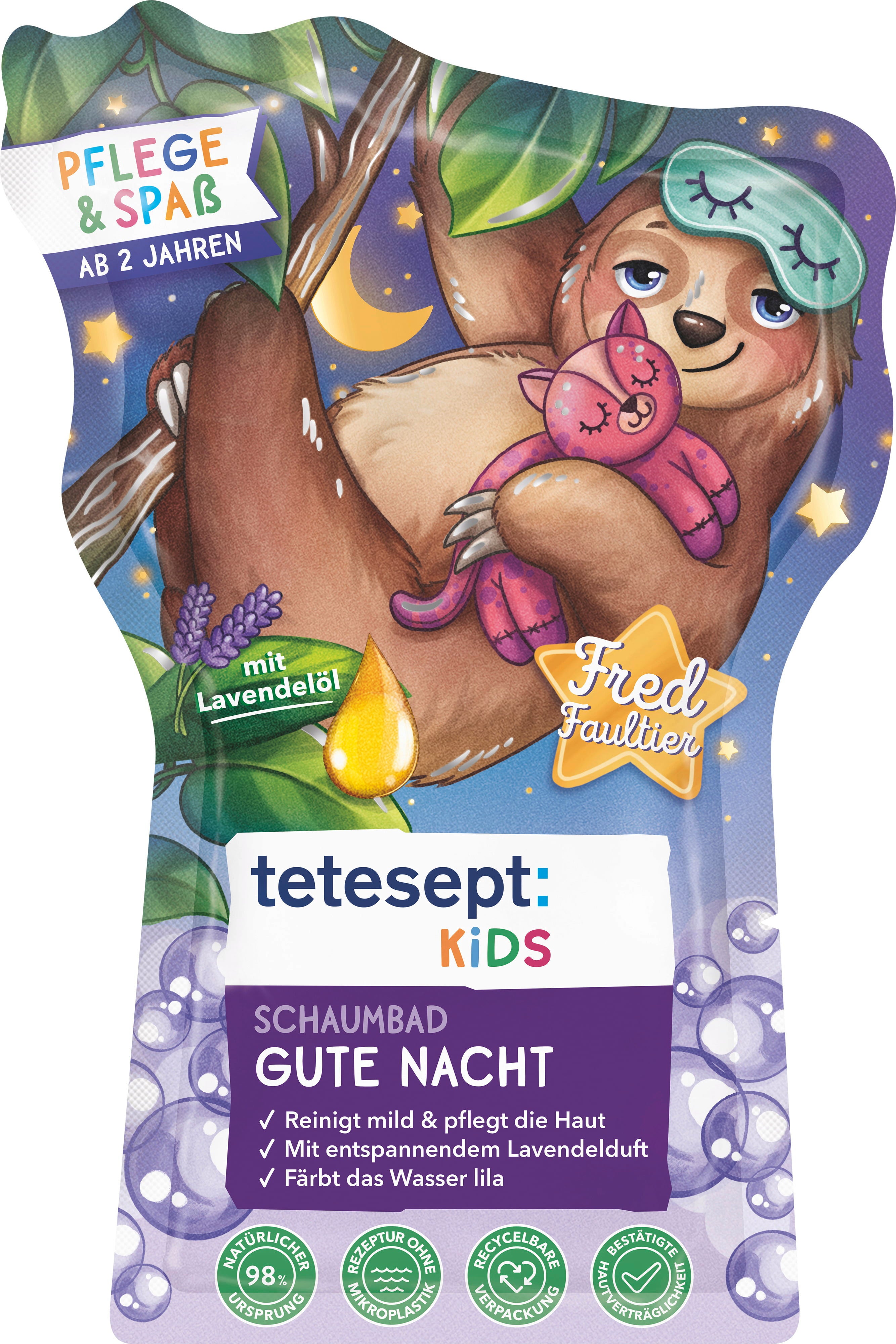 Med tetesept Skumbad God Natt ger du barnen från 2 år ett avslappnande kvällsbad. Skumbadet doftar ljuvligt av lavendel, innehåller vårdande aloe vera och löser sig lätt i vattnet. Vattnet färgas lila med livsmedelsfärg – utan att färga av sig på hud, hår eller badkar. Produkten består till 98 % av naturliga ingredienser och är fri från mikroplast – för ett rofyllt och tryggt bad.