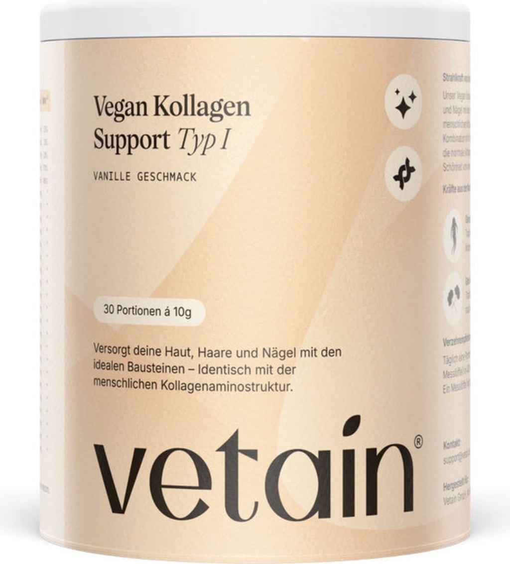 Vetain Veganskt Kollagen Typ 1 är baserat på VeCollal® Typ I – ett växtbaserat ämne med ett aminosyraprofil som liknar kroppens eget typ I-kollagen. Produkten innehåller dessutom en noggrant sammansatt mix av mikronäringsämnen: C-vitamin, zink och biotin som kompletterar aminosyrorna. För ytterligare effekt innehåller pulvret växtextrakt som ginsengrot och gotu kola, samt inulin för en behaglig konsistens.