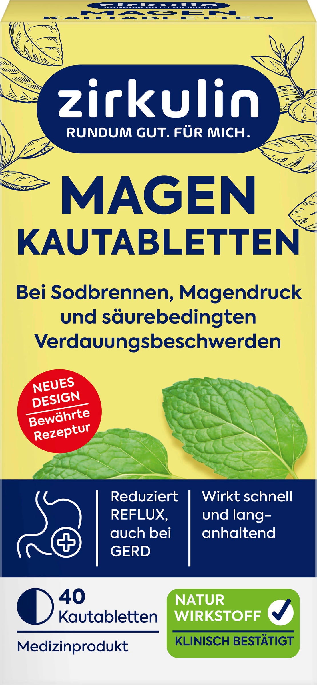 Zirkulins tuggtabletter för magen har en mild mintsmak och baseras på brunalgextrakt. De är fria från färgämnen, gluten och laktos.