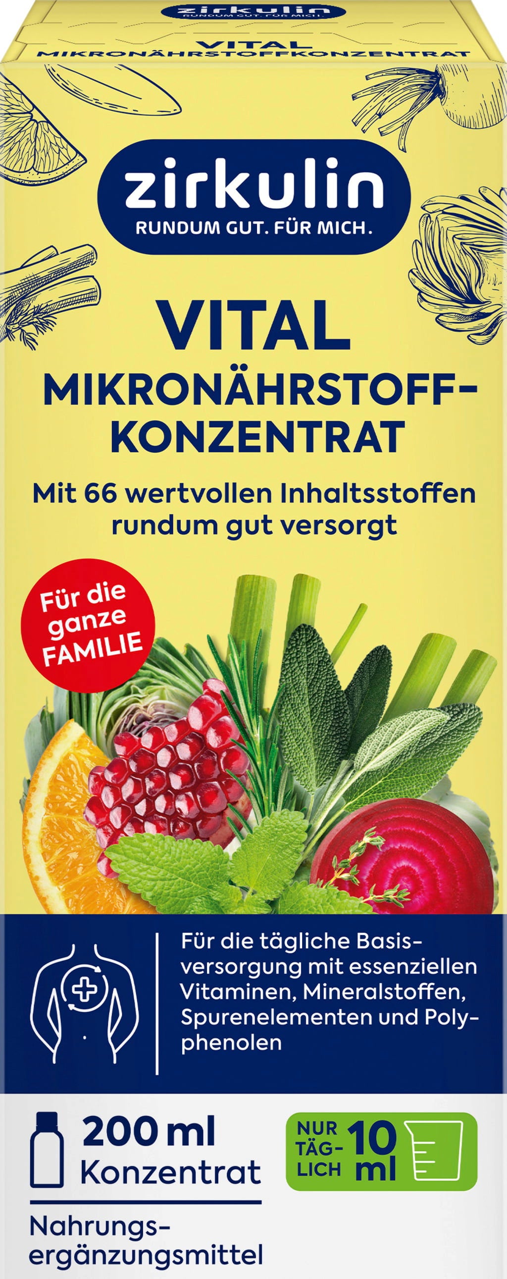 Zirkulins Vital mikronäringskoncentrat passar utmärkt som dagligt basstöd för hela familjen. Den veganska sammansättningen innehåller en bred mix av vitaminer, mineraler, spårämnen och polyfenoler.